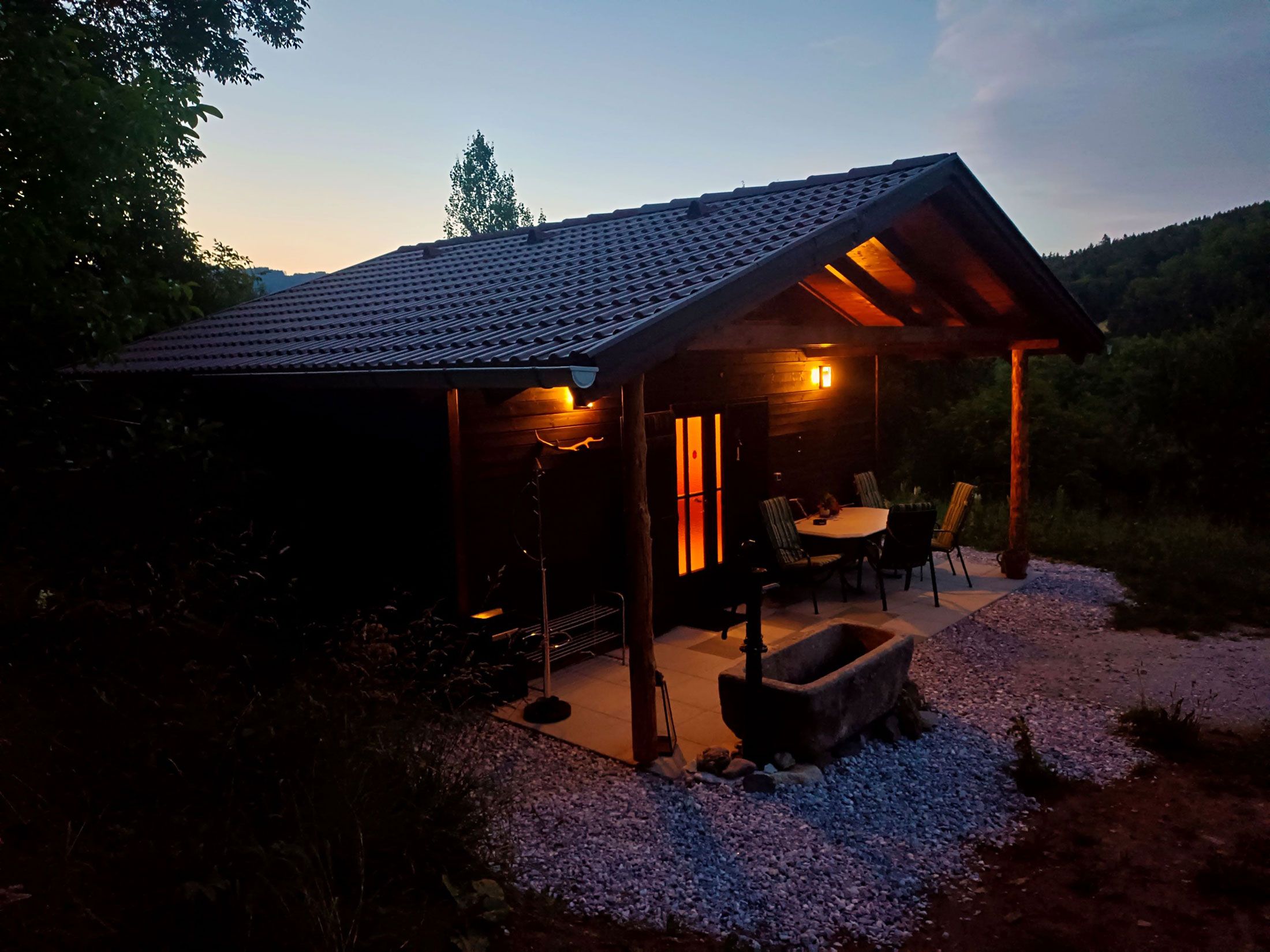 The early morning hours can be enjoyed on the terrace of the wooden hut, adorned by the chirping of birds and the first rays of sunshine falling on the hut and the faces of the vacation guests. In the garden you will be greeted by our free-roaming animals - four cats, our dog Bobby, our hens, cockerels and ducks.