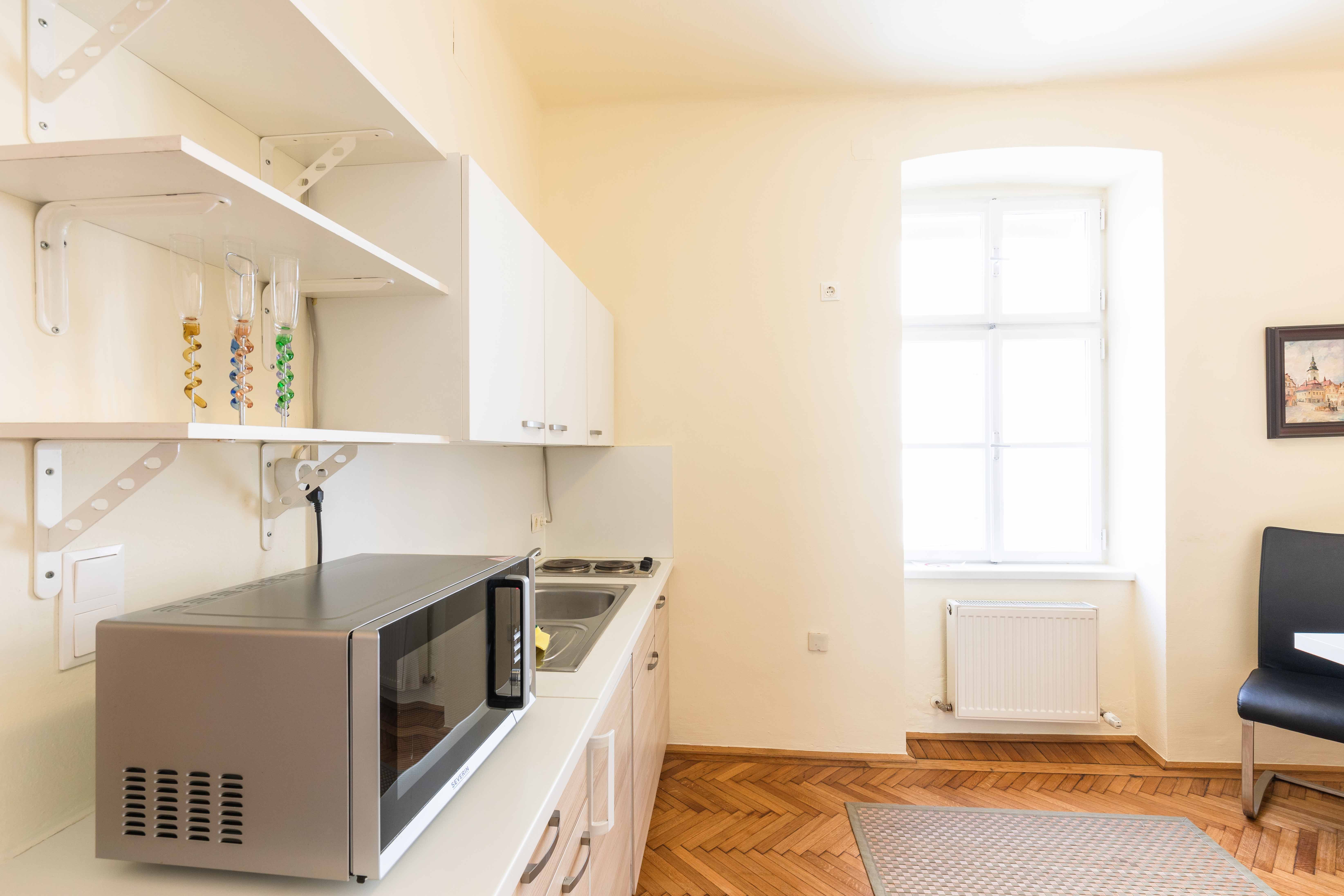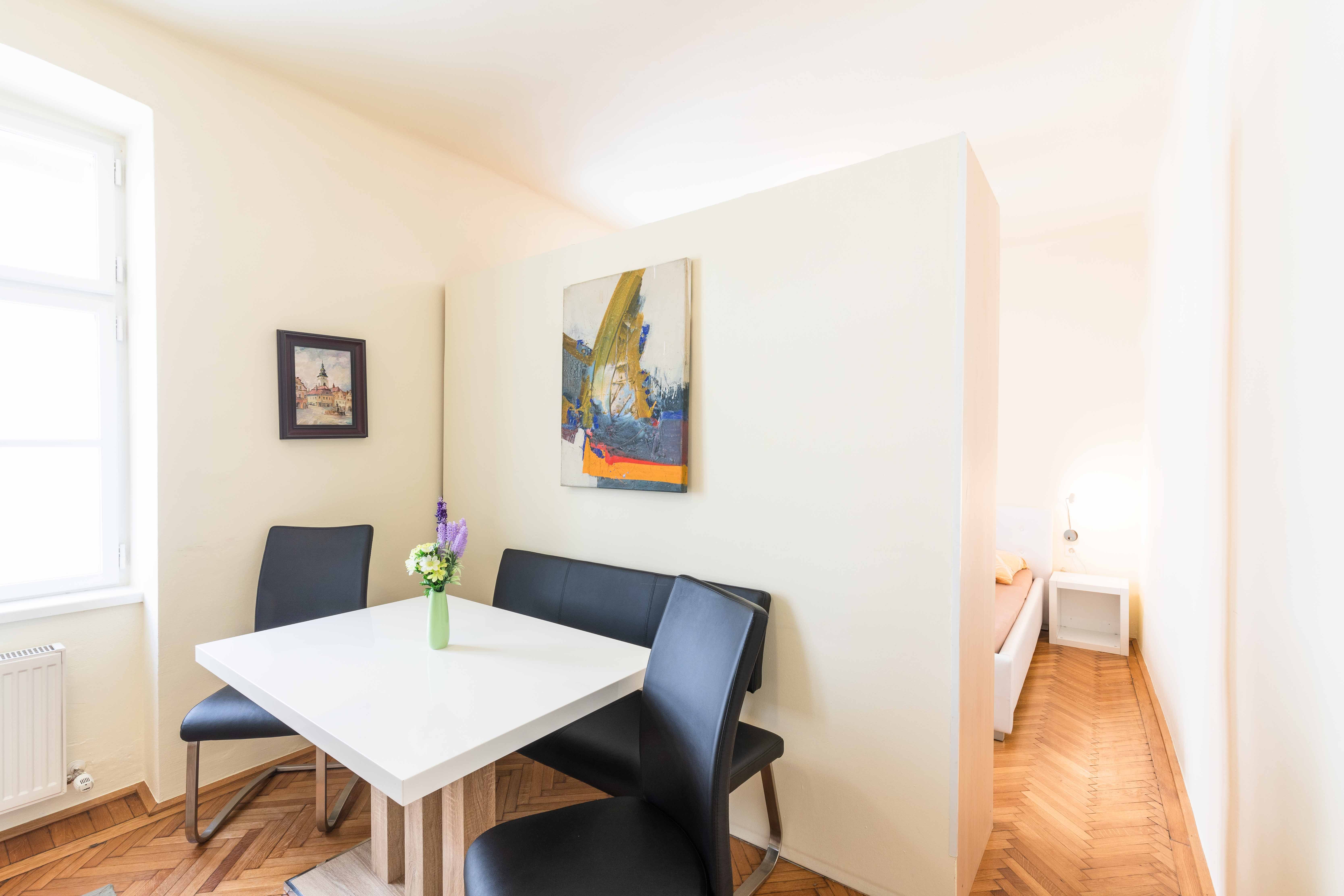 This apartment in an old building is located in the city center of St. Pölten, directly in the pedestrian zone near Rathausplatz. It has a living room, eat-in kitchen, bathroom/WC and room for 2 people.