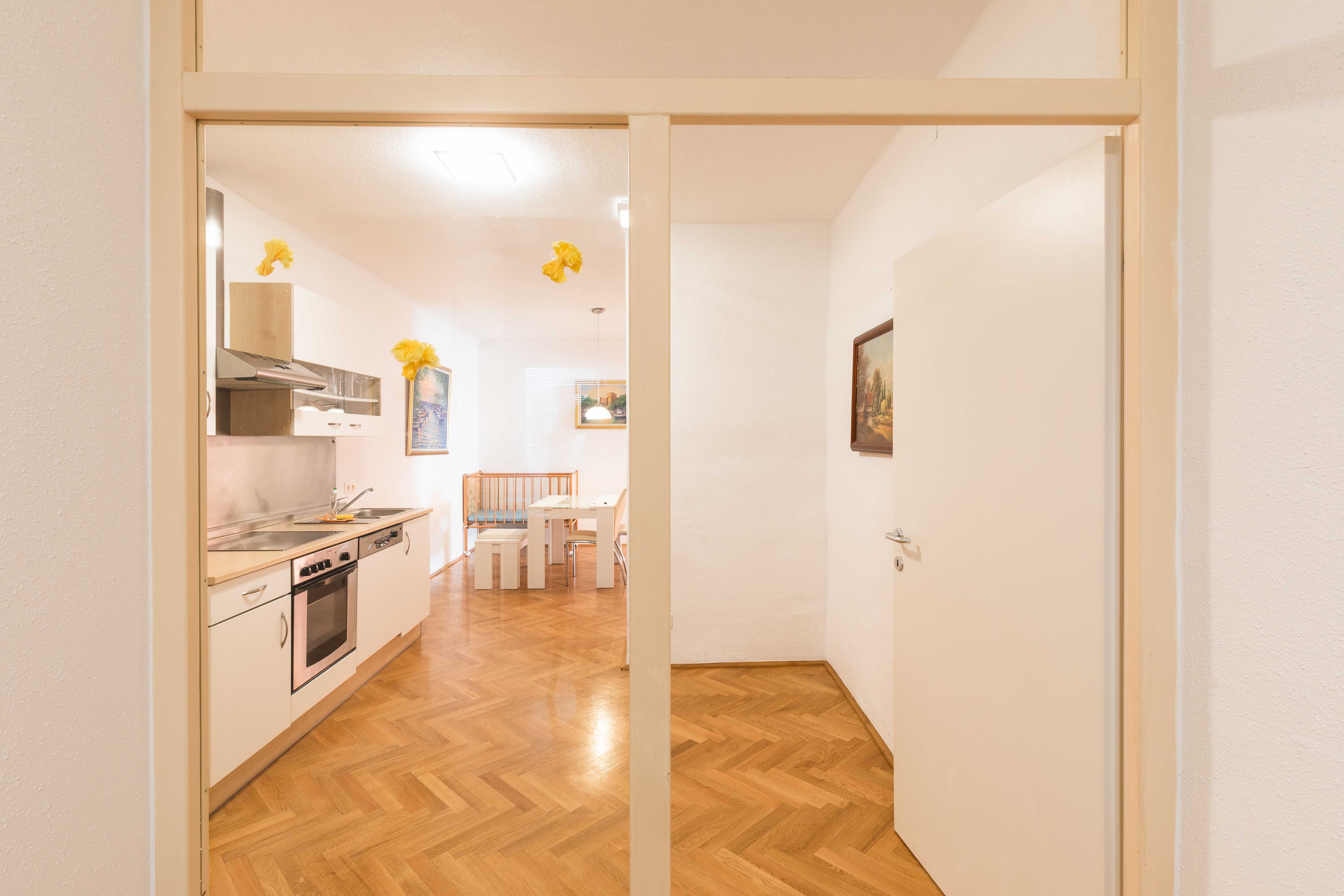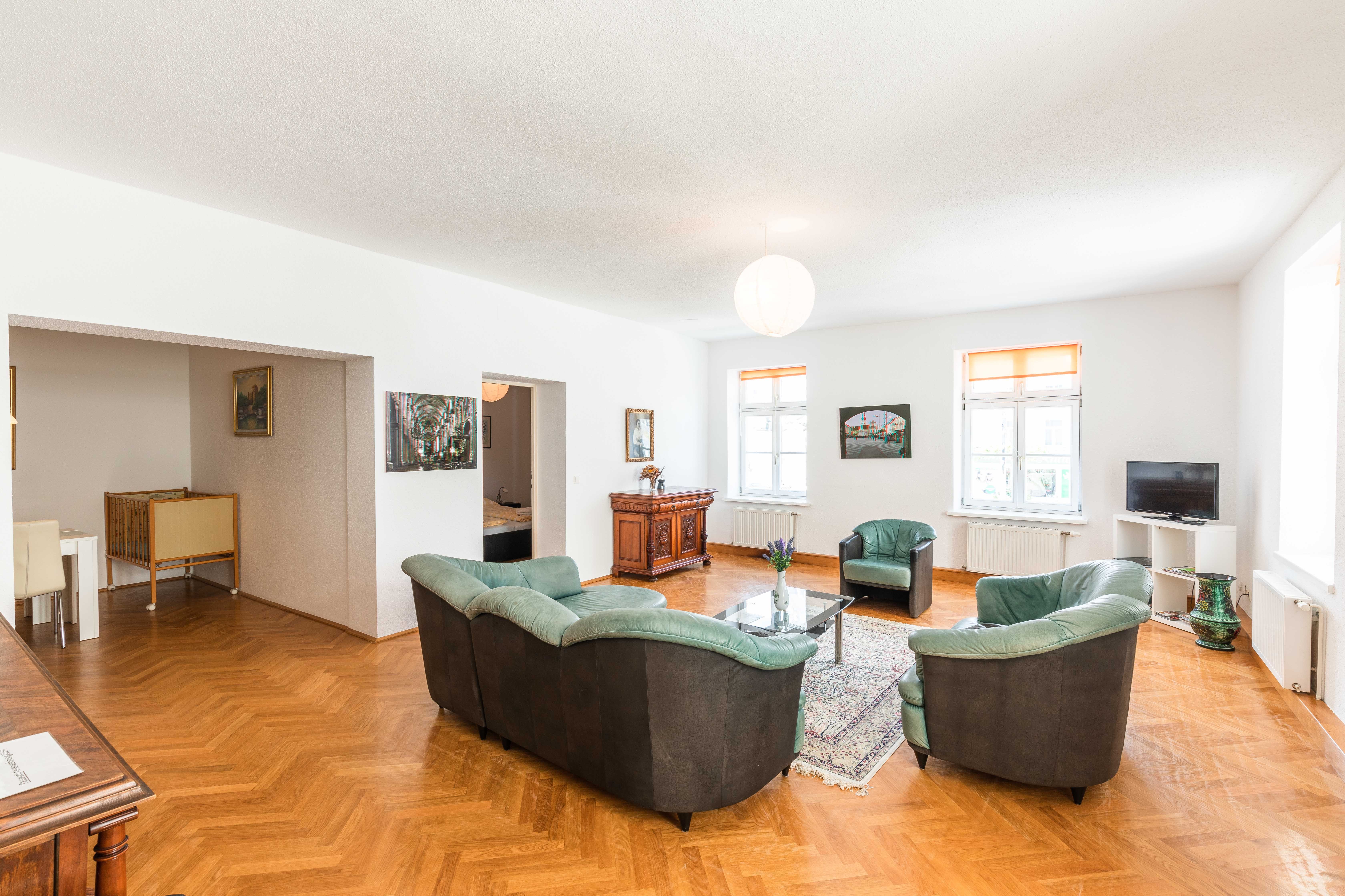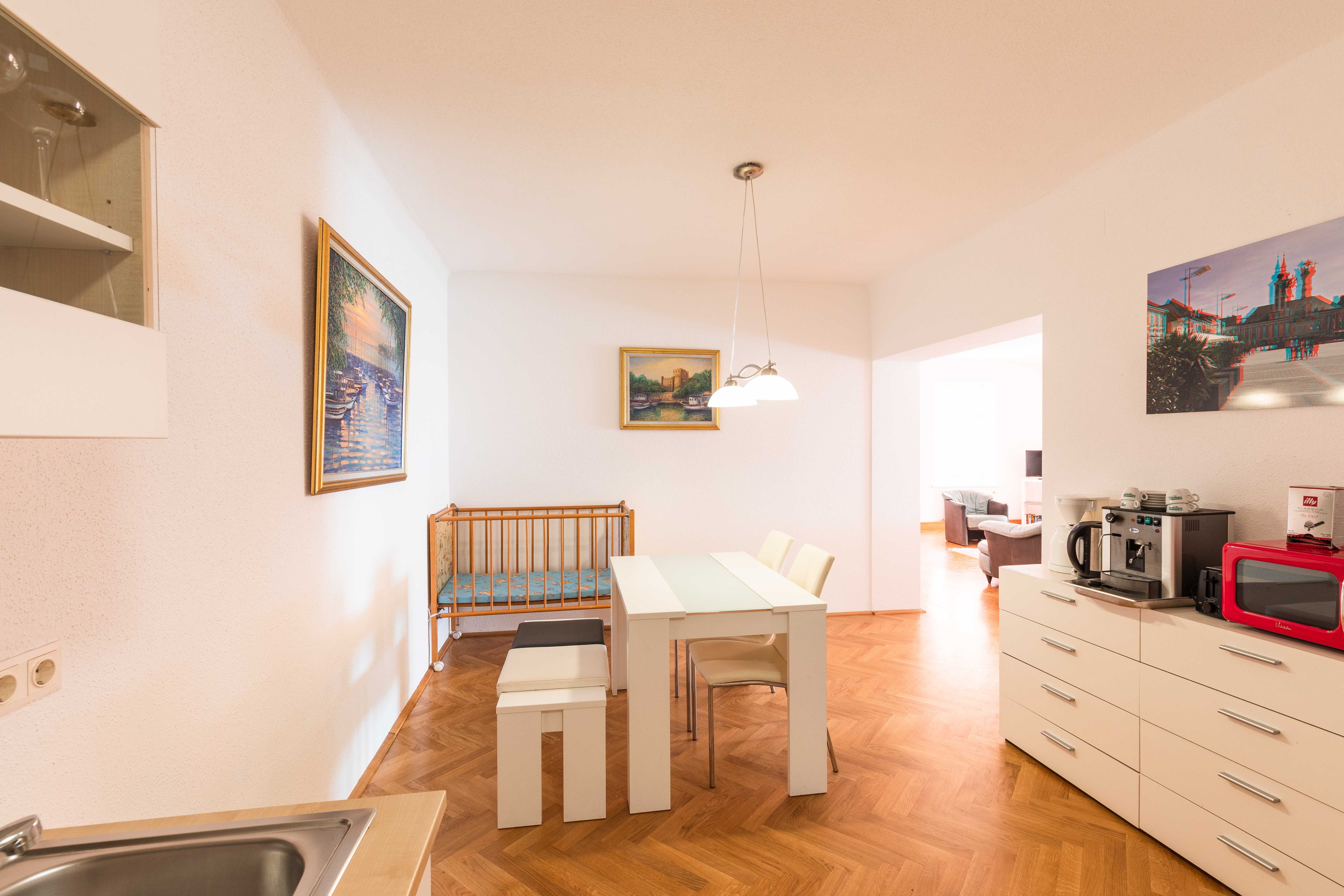 The apartment is very comfortable and spacious, approx. 120m2. It has a large living room, 2 bedrooms, eat-in kitchen, anteroom, bathroom and WC and can accommodate up to 6 people. The apartment is located in a lovingly renovated old town house and therefore exudes a special charm. Due to its size and facilities, it is particularly suitable for families with small children.