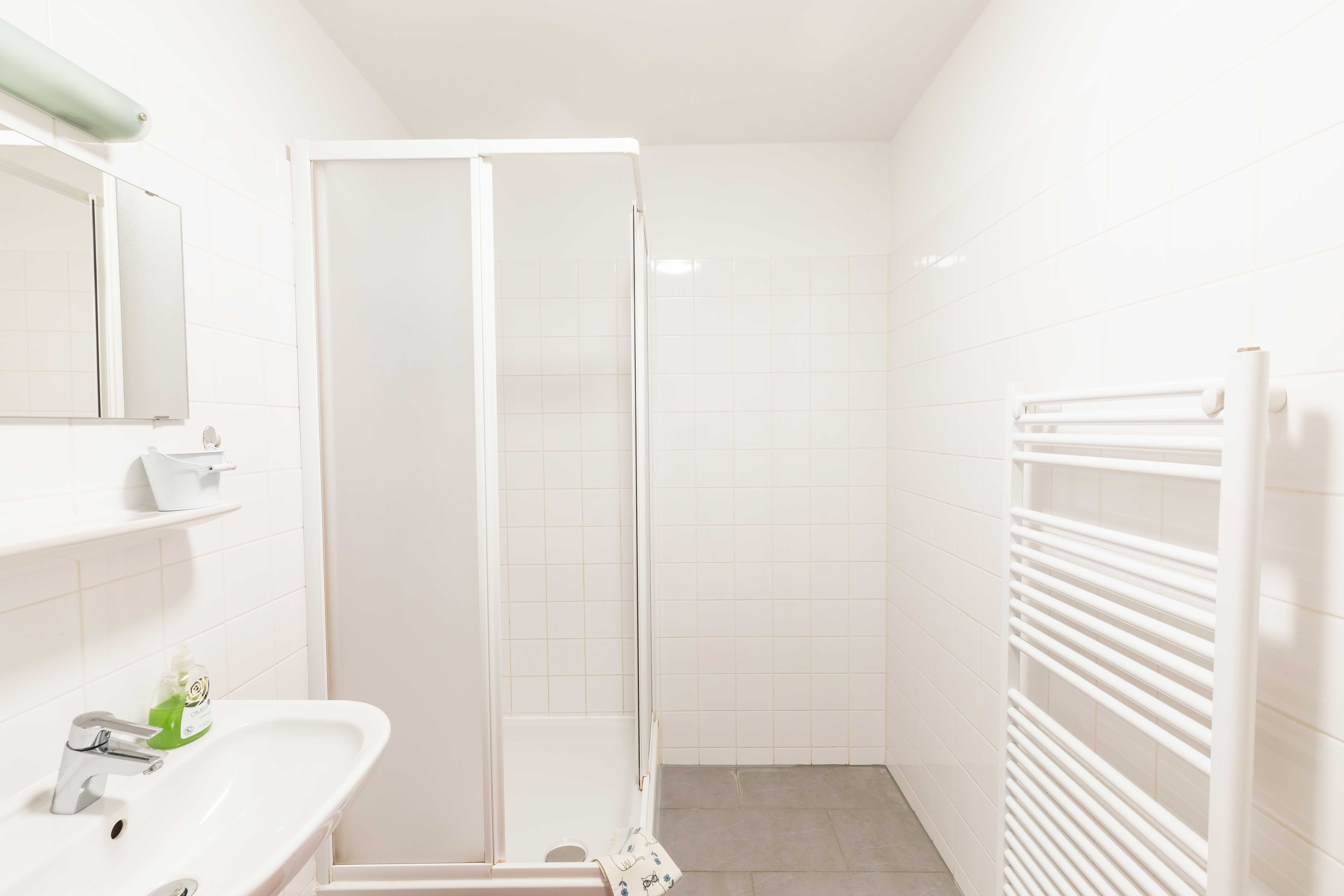 Bathroom with shower (towels), washing machine, hairdryer