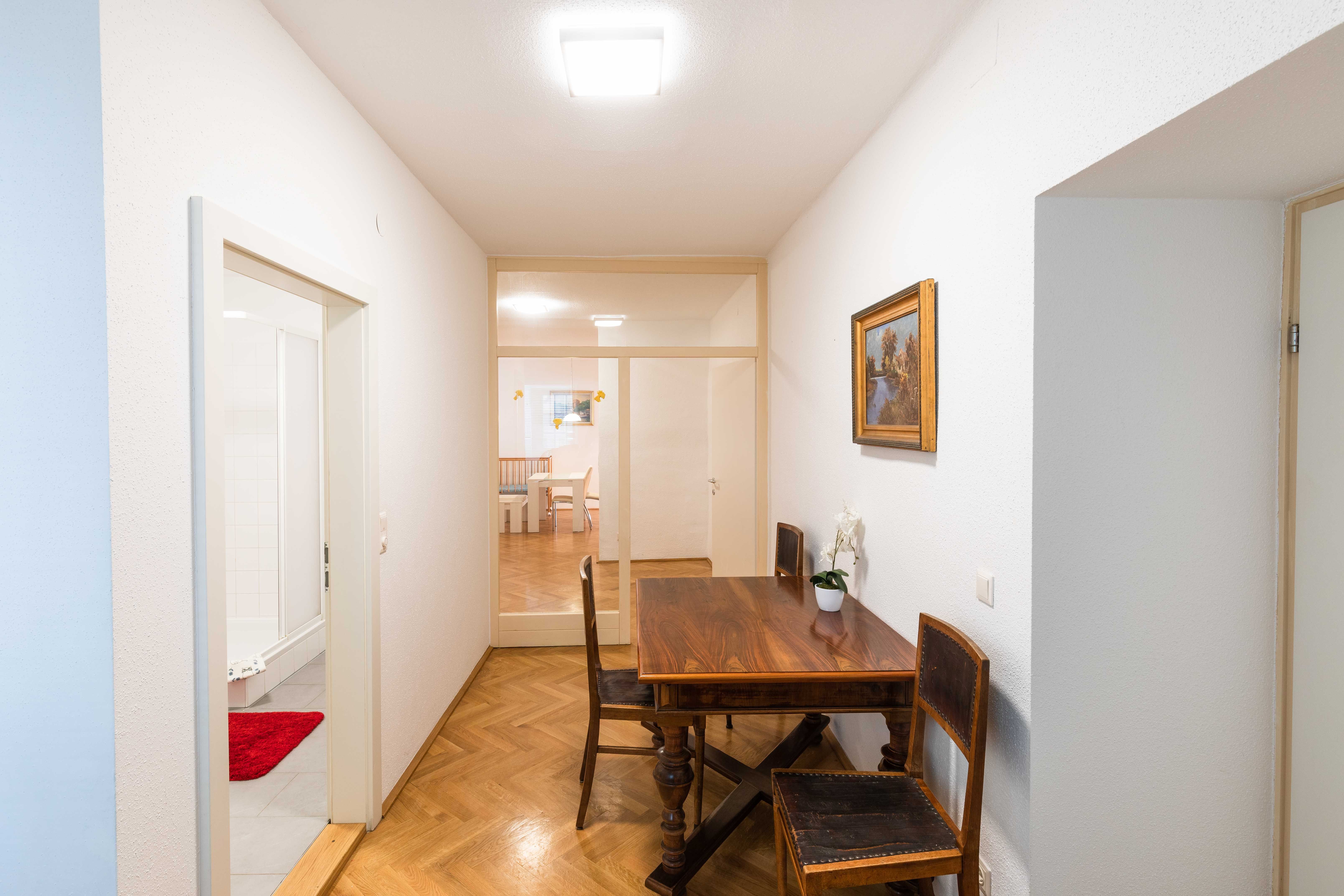 The apartment is approx. 5 minutes' walk from the train station and therefore easily accessible by public transport. If you come by car, the Roßmarkt underground parking garage (1 minute) under the Rathausplatz is in the immediate vicinity.