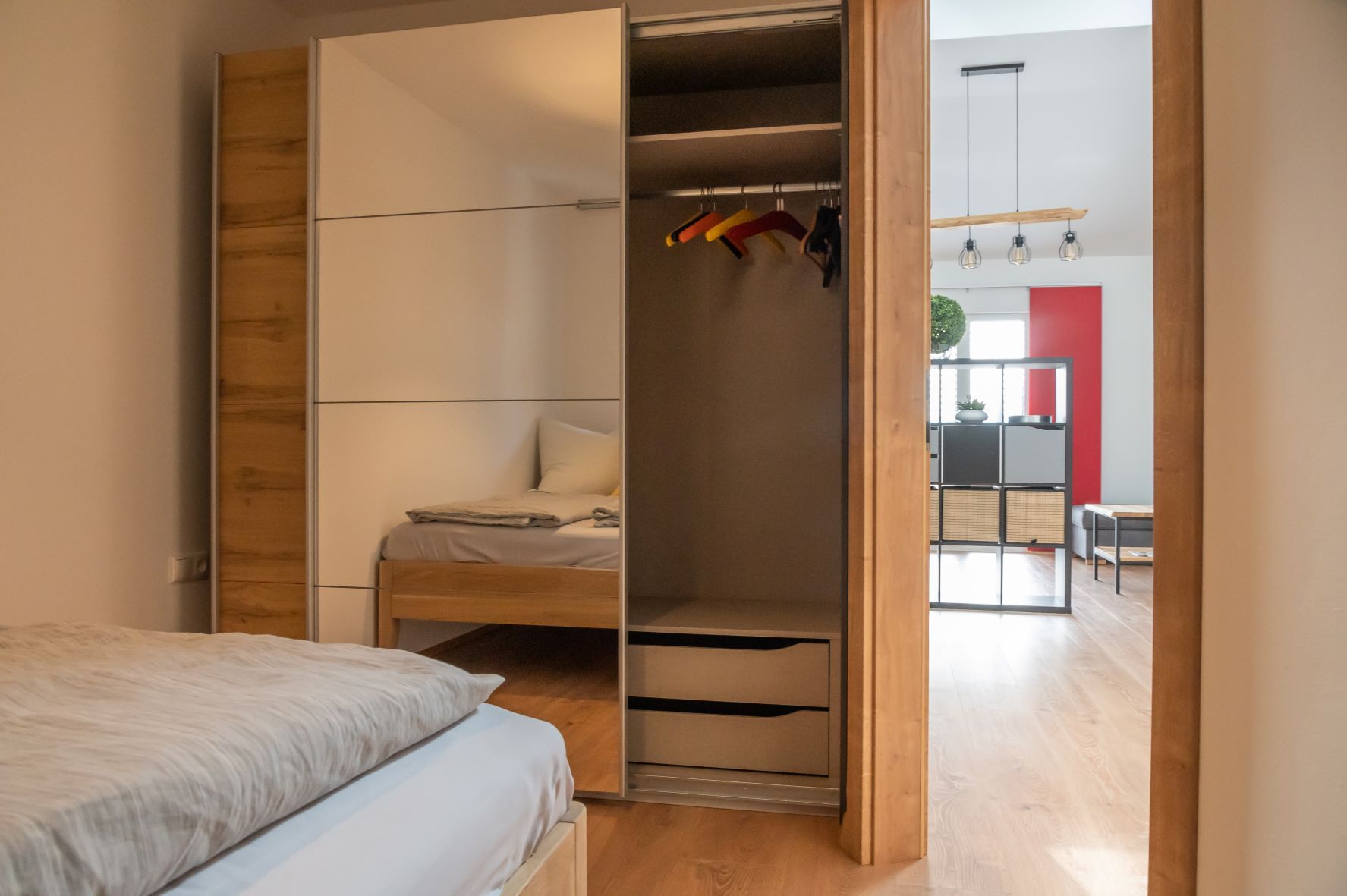 The bedroom has a double bed and a sliding-door wardrobe ready for you. Relax on the couch or use it as an additional sleeping option for two people.