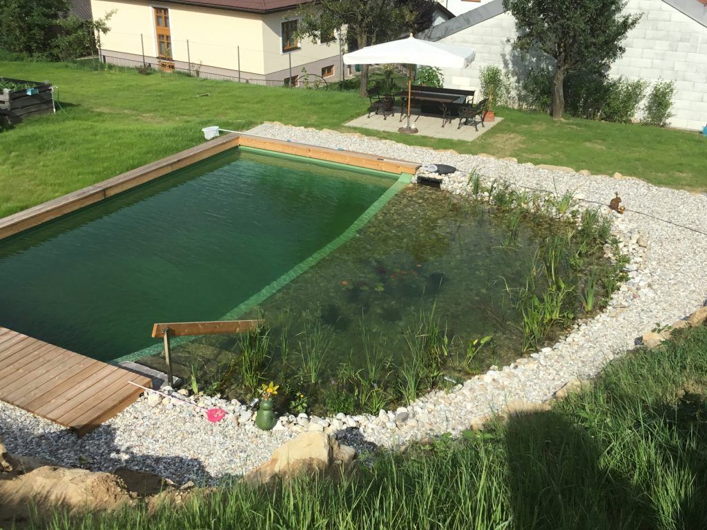 large, well-kept garden with swimming pond, cozy seating areas and barbecue facilities