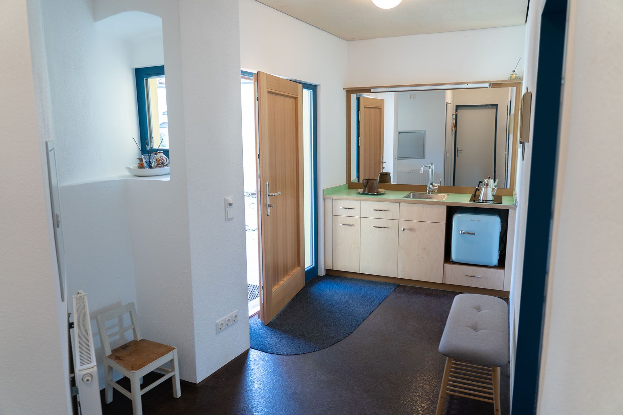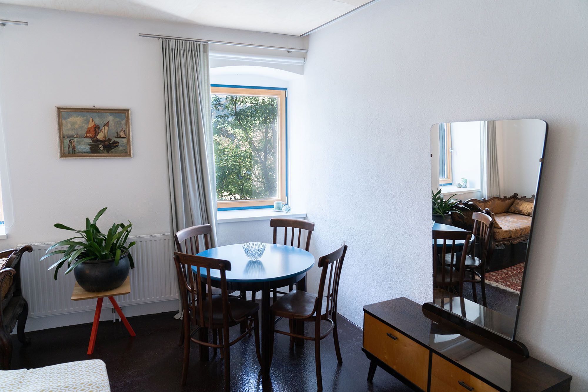Our vacation apartments are all located in the historic part of the house, the building fabric of which we have renovated but preserved as far as possible. The unevenness of the walls plastered with special, air-entrained insulating plaster is just as reminiscent of this as the warm, dark red mastic asphalt, which interprets the rammed earth floors of the past in a contemporary way.