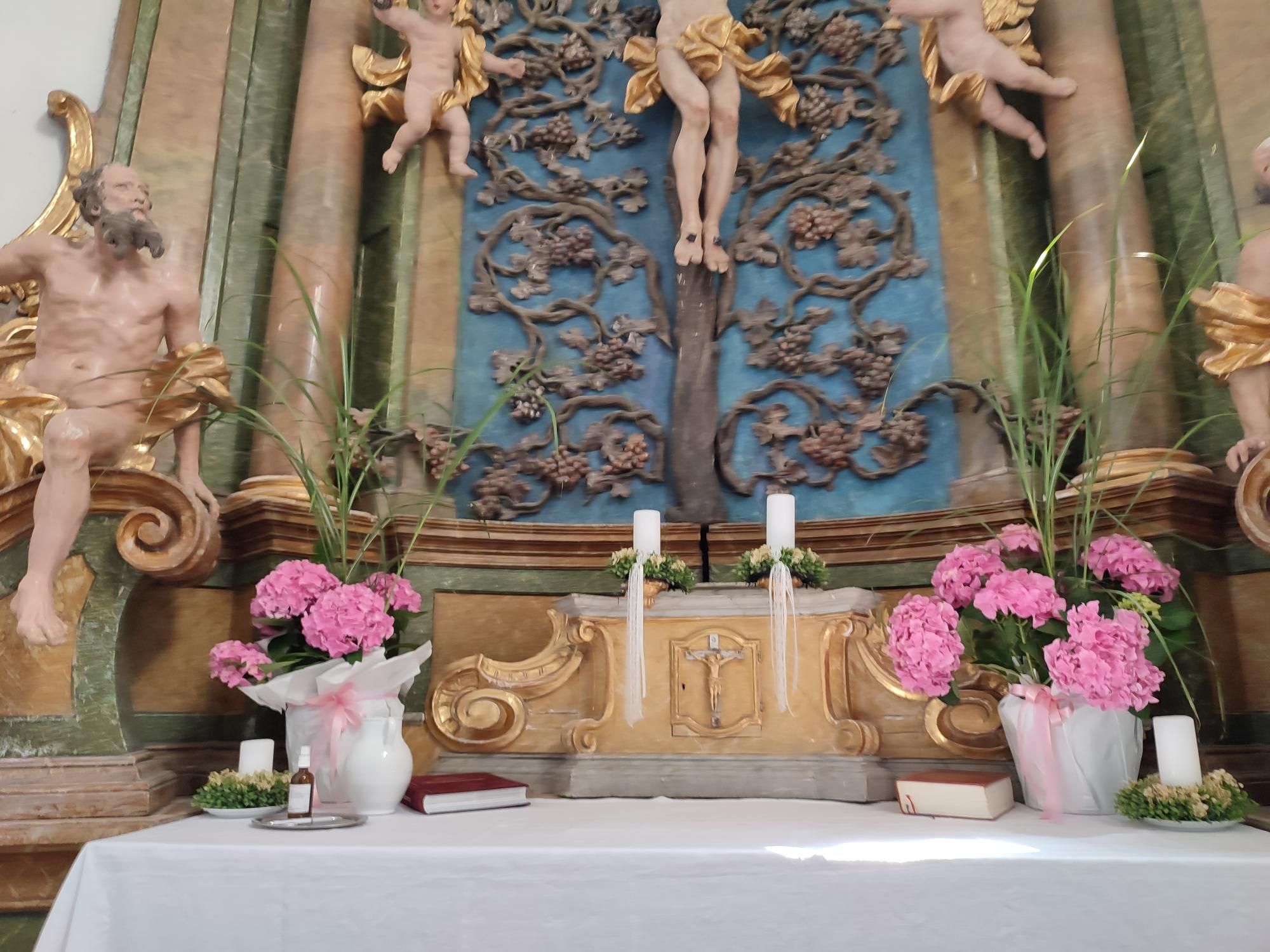 The chapel, which dominates the architectural ensemble, was built in 1516 in honor of John the Baptist. It houses the "Giuliani Altar" with its famous statue of Christ, surrounded by vines and grapes, with the inscription "I am the true vine".