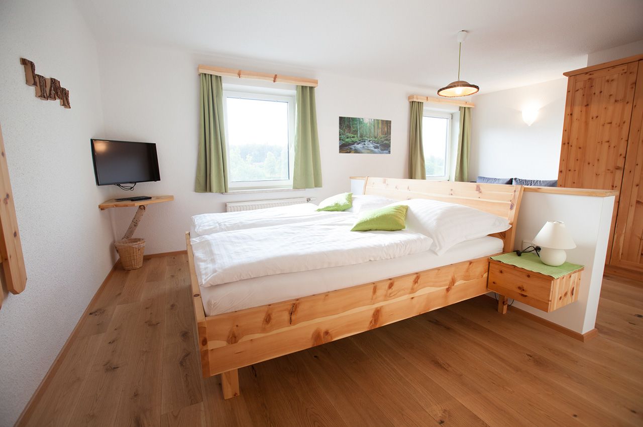 In our comfort rooms you will find light-colored wooden furniture made of maple, pine or Swiss stone pine. Enjoy a fantastic view of the greenery from every room. Our 10 comfort rooms are all non-smoking and offer space for up to 28 people. We have designed them to be new and modern, but just as cozy. The fresh air, the peace and quiet and the smell of wood will make you sleep wonderfully!