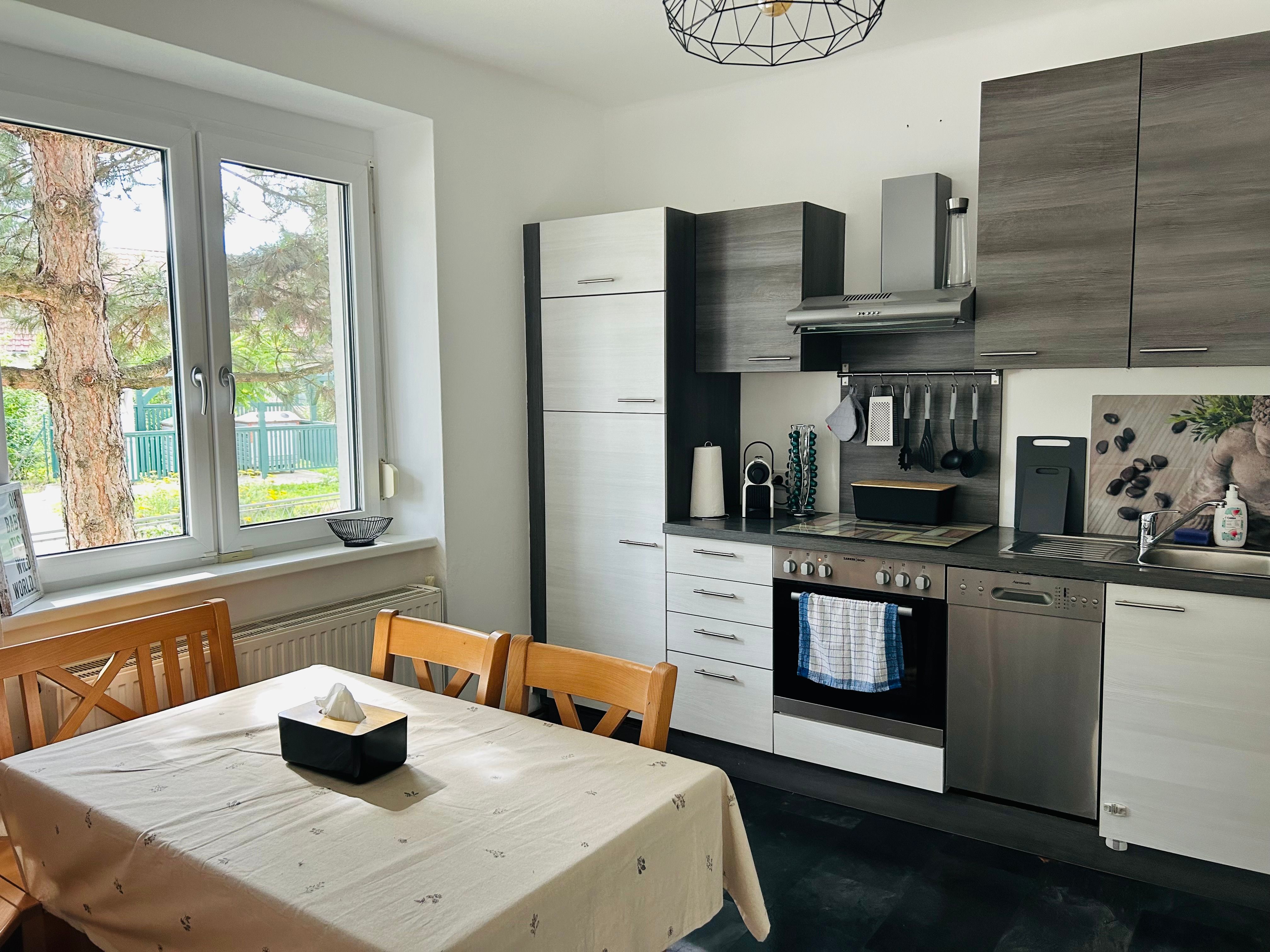 The Mayerei Guesthouse in Trübensee near Tulln combines stylish living with high functionality - ideal for business travelers, trade fair guests or anyone looking for a relaxing break near Tulln. A modern, newly renovated vacation home with lovingly selected furnishings awaits you on 65 m²: a quiet bedroom with high-quality mattresses, a spacious living room with 55-inch smart TV and fast WiFi, a fully equipped kitchen, a bathroom with rain shower and a separate WC.