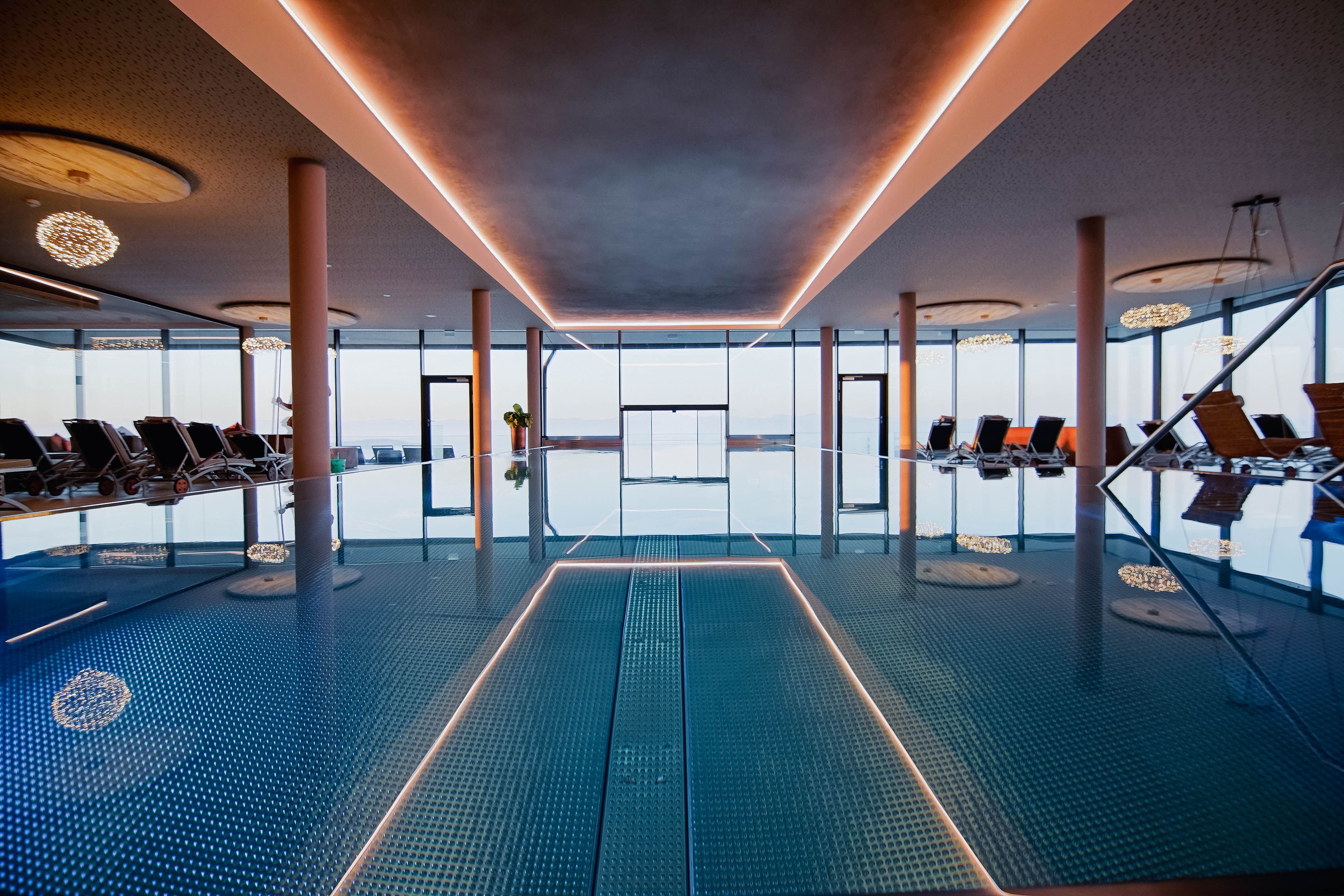 The outstanding wellness concept "Wachauf-SPA" extends over two levels and offers an extraordinary spa experience on around 1,300 m². This includes a 21 m long infinity pool (indoor 15 m / outdoor 6 m), several saunas (panorama, bio, textile sauna), brinesteam bath, infrared cabin, a modern fitness room "Kraftwerk", the FITamin Lounge as well as cozy relaxation rooms and a Sky Lounge with panoramic views.