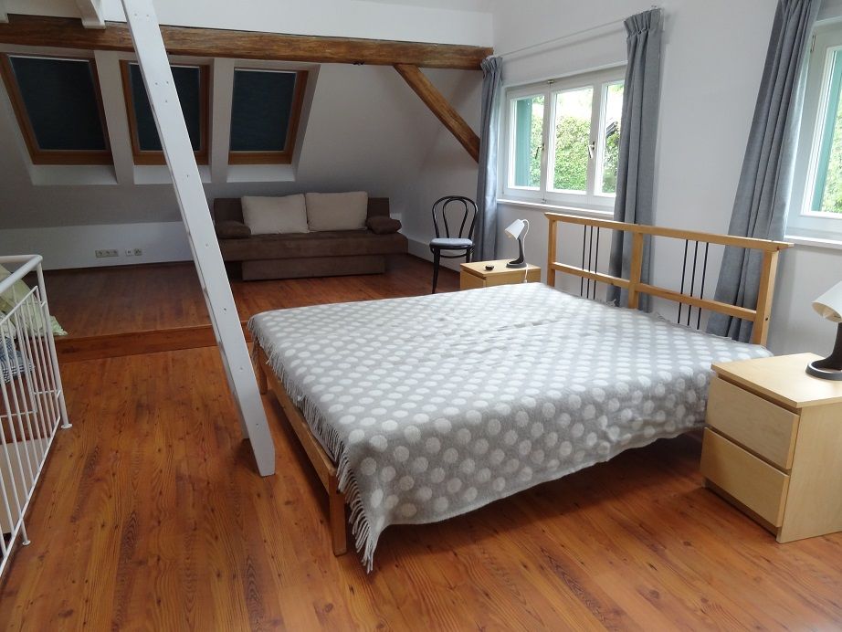 Asmall library with a colorful mixture of books invites you to linger and relax. The staircase to the upper floor leads to the sleeping area. The entire upper floor is open and is divided into a sleeping area with a cozy double bed, a pull-out couch for lounging and a ladder to the loft bed. The apartment offers space for 2 to 5 people. Shower and WC are also available in the room.