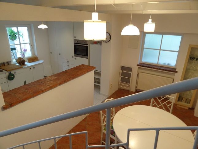 The ground floor is divided into a kitchen area with a spacious kitchen island (well equipped), a cozy living area with seating and the fireplace* should provide pleasant warmth on colder days. TV, radio and W-Lan are part of the standard equipment. *Wood for fireplace available
