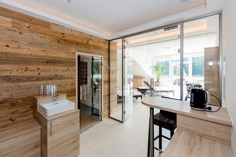 The wellness area has an organic Swiss stone pine sauna, infrared cabin, wellness shower with Kneipp treatments and a relaxation zone with an impressive panoramic view of the Gemeindealpe. Opening hours: daily from 09:00 - 22:30.