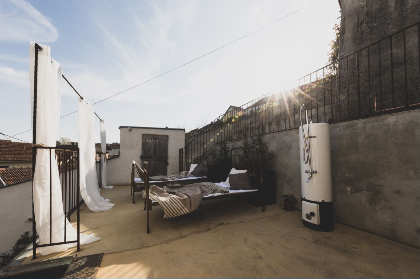 Sun terrace with brass loungers and outdoor shower