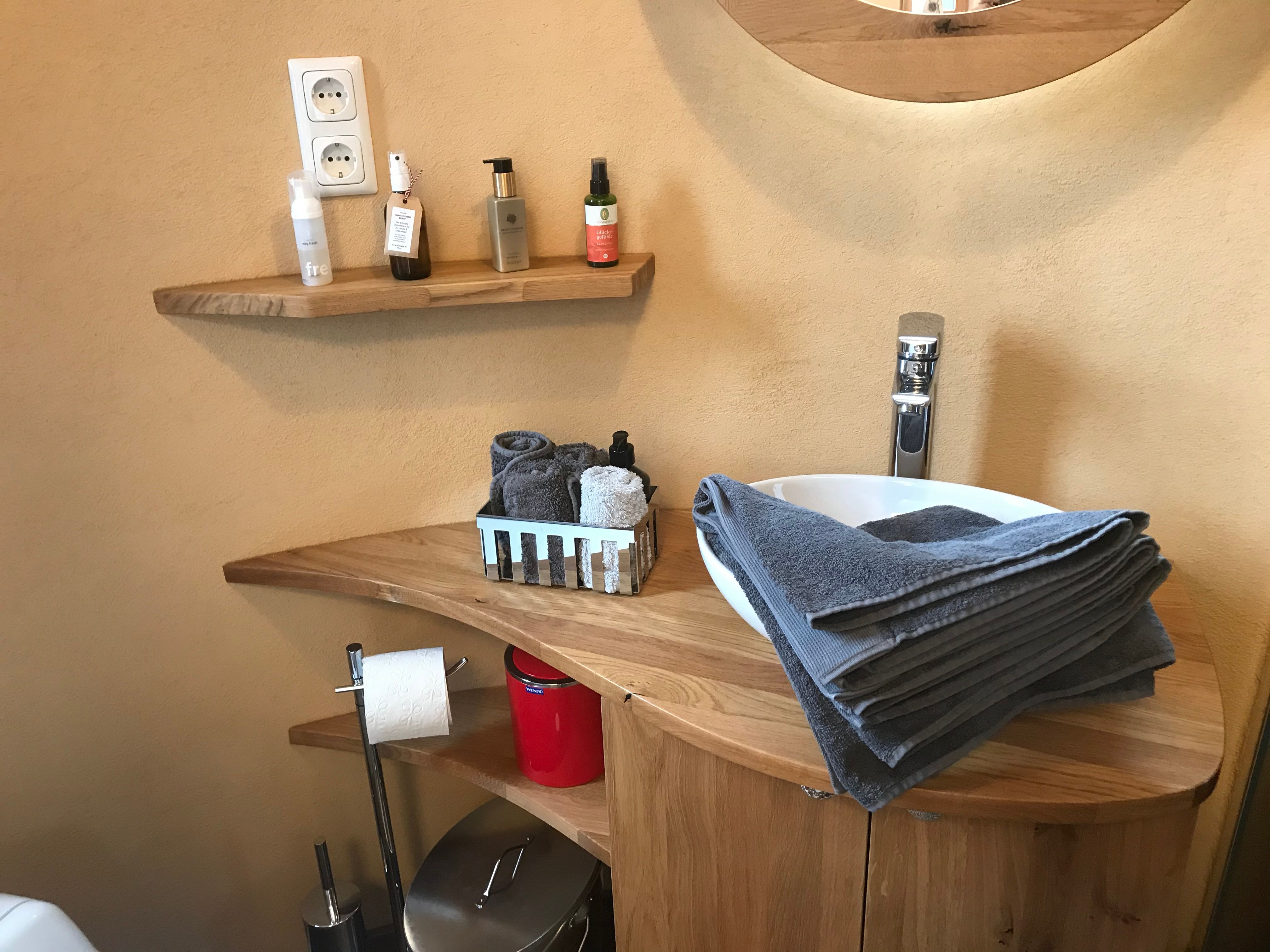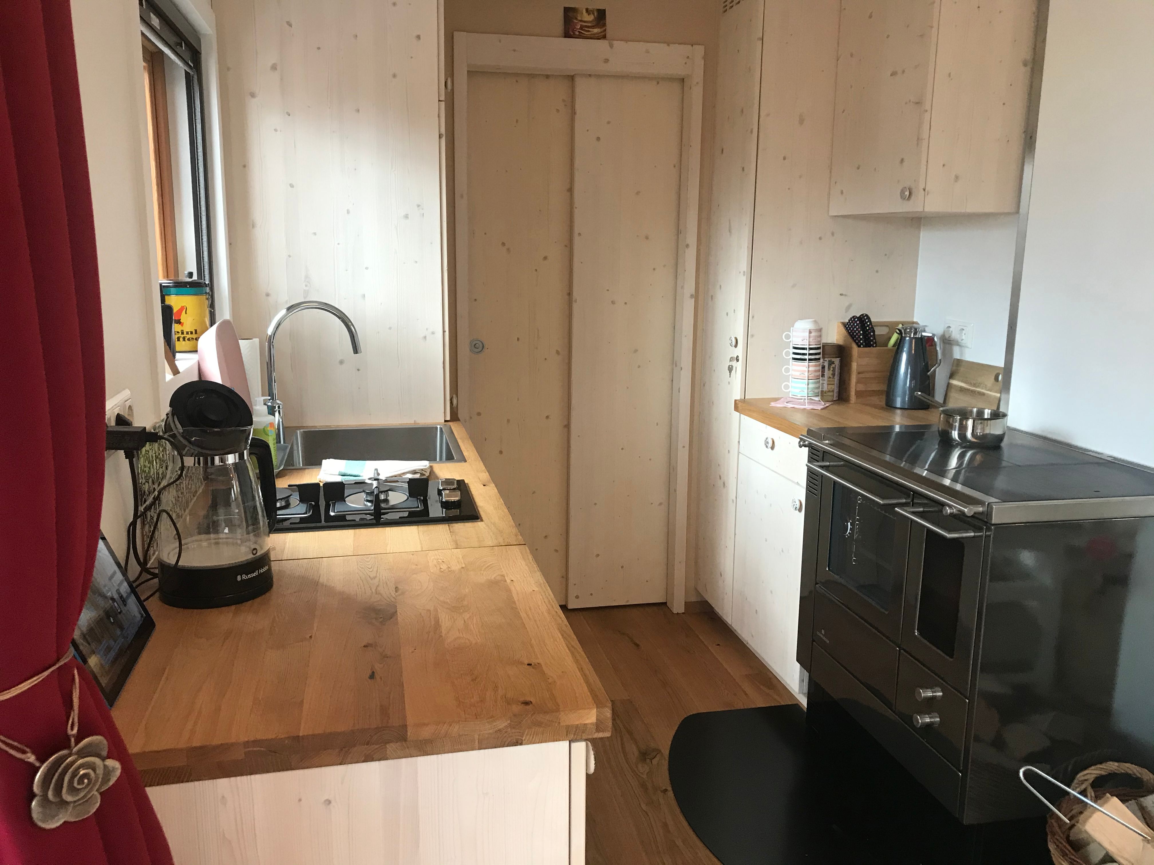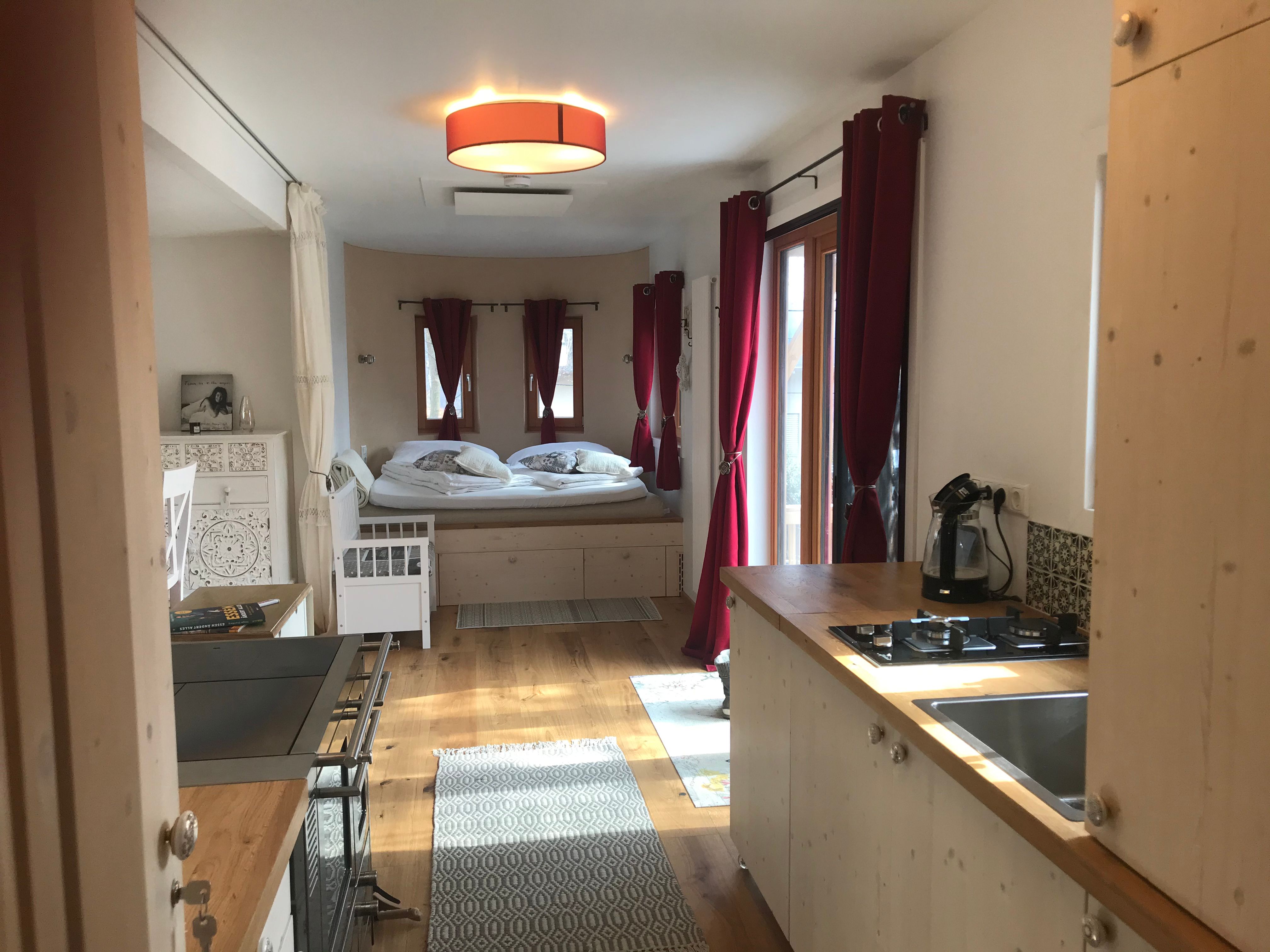 The Tiny Houses Schneeweißchen & Rosenrot on the outskirts of Vienna in the western Vienna Woods offer full comfort in a small space. They are mobile, partially self-sufficient, winter-proof wooden caravans with a garden and terrace. Schneeweißchen has approx. 18m² and is equipped with a photovoltaic system. There is a kitchen with a water-fired wood-burning stove, 2-burner gas hob, bathroom with shower and composting toilet. A super-large double bed offers space for 2 people. Schneeweißchen stands together with Rosenrot in a 600m² fairytale garden. Rosenrot has approx. 33m² and is equipped with a photovoltaic system. There is a kitchen with a water-fired wood stove, 2-burner gas stove, bathroom with shower and composting toilet. A super large double bed for 2 people. The property is located in a quiet cul-de-sac with direct access to the forest. Forest bathing, Wienerwald hiking trails, mountain biking, mountain bike trail center and summer toboggan run round off the stay.