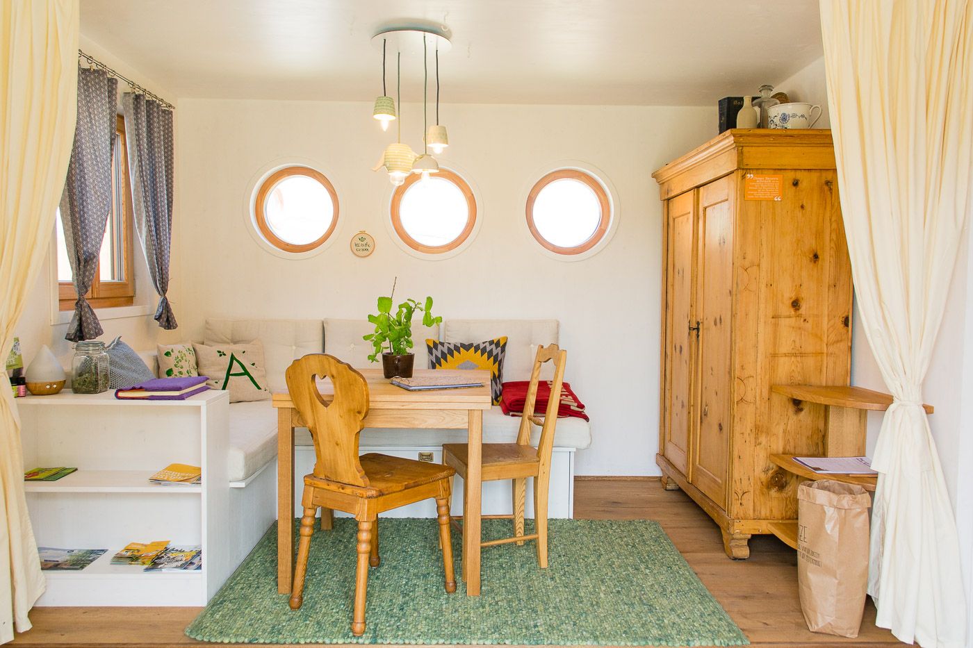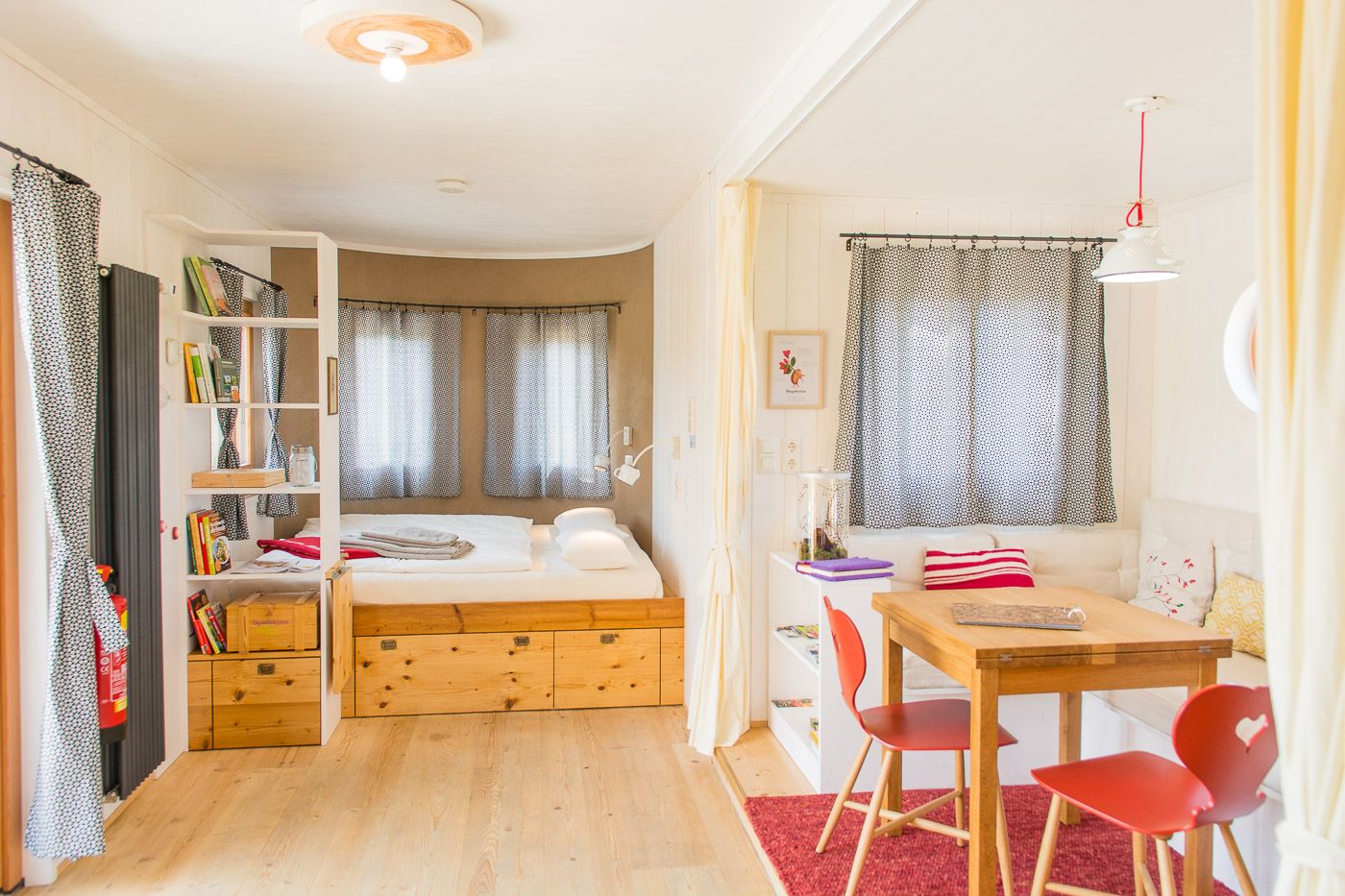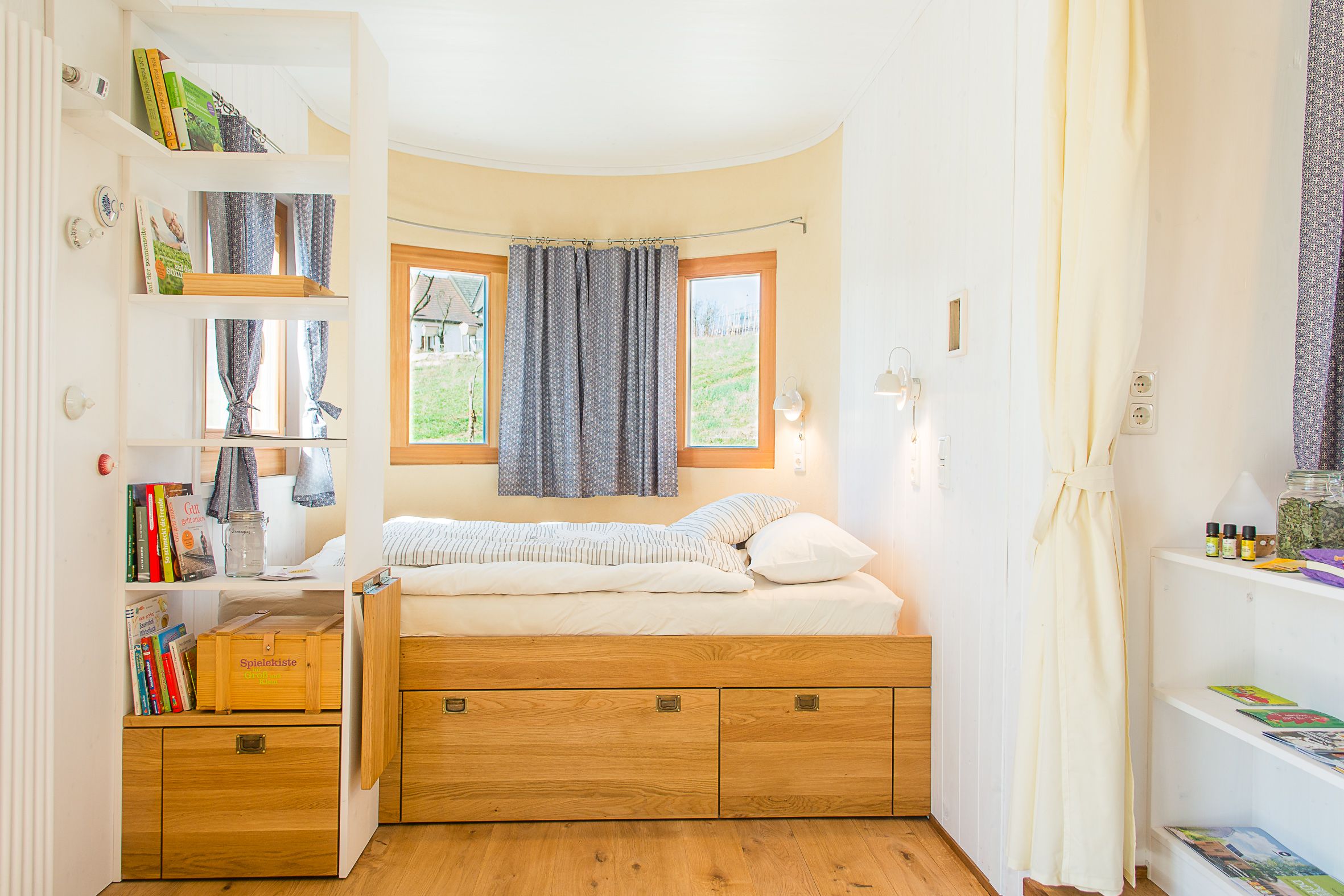 On 31m2 each, these two unique overnight accommodations invite you to enjoy nature to the fullest, clear your mind and let your soul dangle. Built from 100% regional raw materials such as solid wood and sheep's wool, the two caravans each offer space for 4 people or a family of five. The two country lofts are equipped with a fully-fledged kitchen, shower and a spacious living and sleeping area. Unique furnishing details such as a wood-burning stove, an electricity-free coffee machine and a heat buffer tank ensure a smooth energy and resource cycle.
