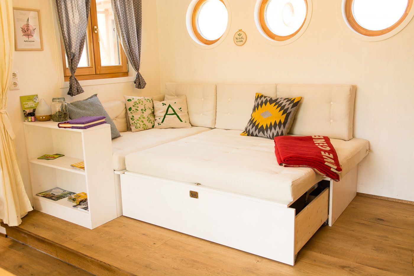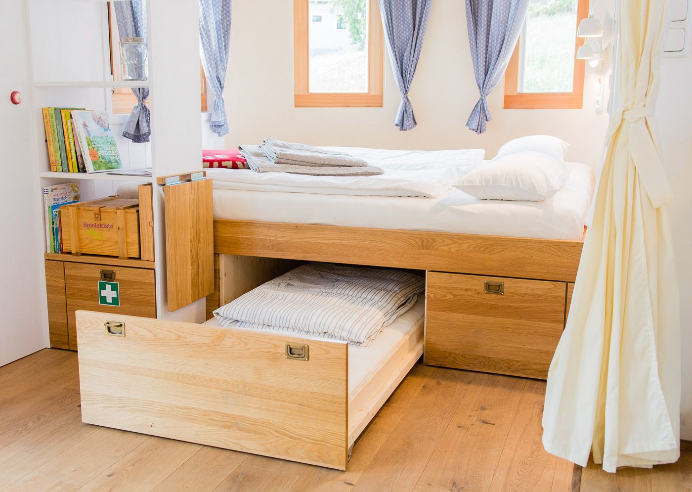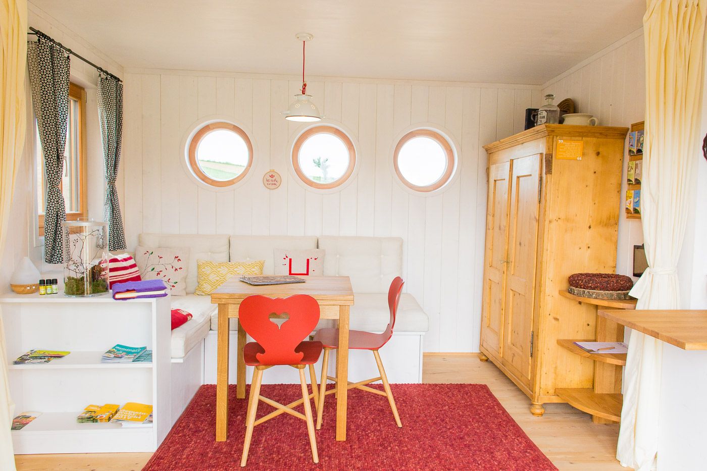 On 31m2 each, these two unique overnight accommodations invite you to enjoy nature to the fullest, clear your mind and let your soul dangle. Built from 100% regional raw materials such as solid wood and sheep's wool, the two caravans each offer space for 4 people or a family of five. The two country lofts are equipped with a fully-fledged kitchen, shower and a spacious living and sleeping area. Unique furnishing details such as a wood-burning stove, an electricity-free coffee machine and a heat buffer tank ensure a smooth energy and resource cycle.