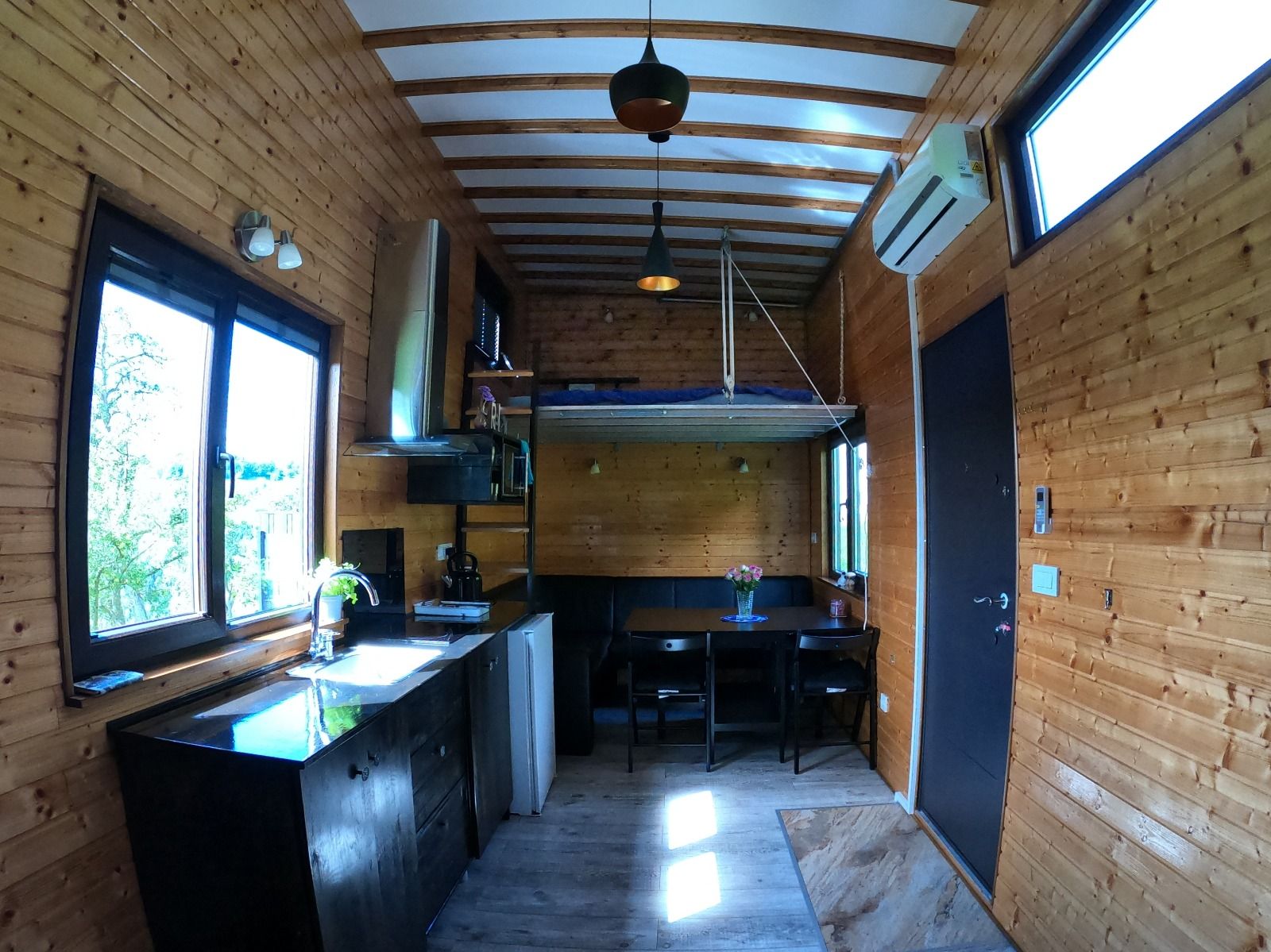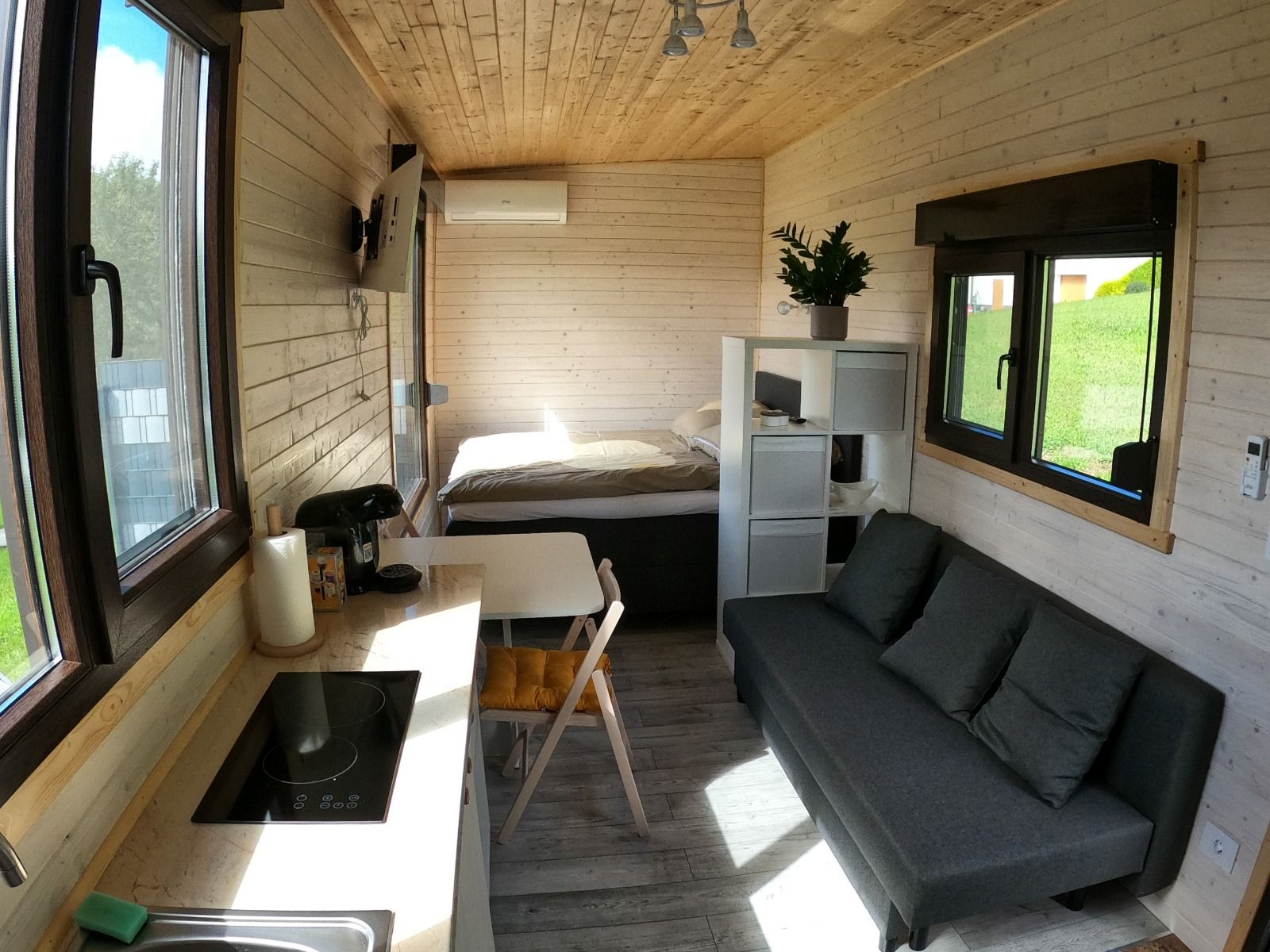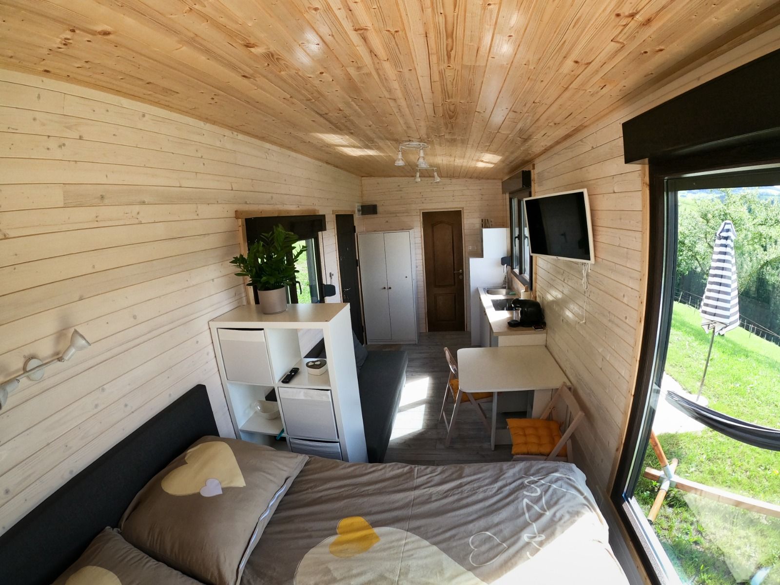 Each Tiny House is equipped with a kitchen, coffee machine, microwave, sleeping bed, sitting area and a closet. The bathroom has a shower with WC, washbasin with towels and hairdryer.