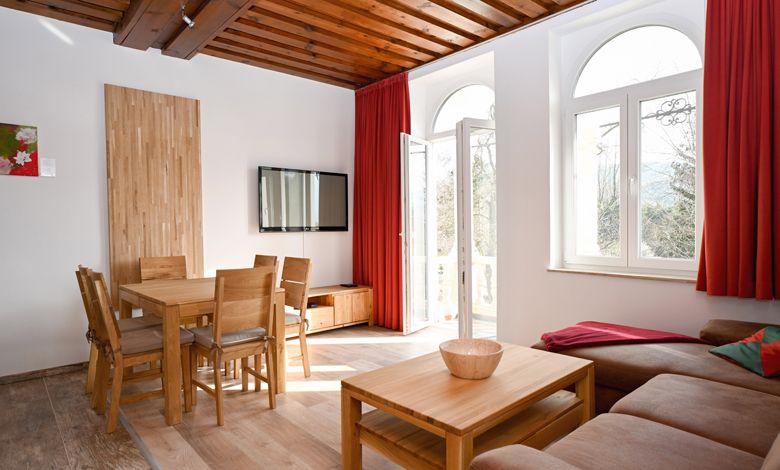 The Waldschlössl with its eventful history (first aristocratic residence in the upper Schwarzatal around 1150 and already operated as a guesthouse in imperial times, later as a health resort) was completely renovated in 2019 and 2020 and now offers exclusively modern furnished vacation apartments and rooms in an absolutely unique building. All apartments and rooms have underfloor heating, the floors are tiled in the anterooms and wet areas and high-quality vinyl in the bedrooms and living areas. All showers are at ground level (without access) and all bedrooms and living rooms offer an incomparable view over the Schneedörfl and Reichenau to the Rax and the Semmering region.