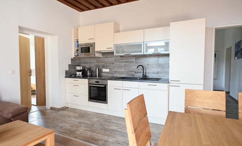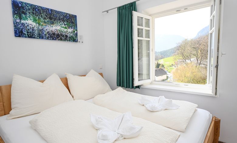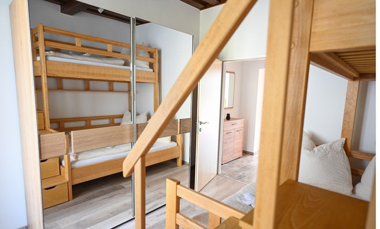 The Rax and Schneeberg apartments each have an eat-in kitchen and two bedrooms. In the parents' rooms there are double beds made of solid wood (in Apartment Rax a four-poster bed), in the children's rooms there are bunk beds, also made of solid wood. Apartment Rax can accommodate five people, Apartment Schneeberg four people. The south-facing balcony assigned to Apartment Rax has a wonderful view and is large enough for dining or simply relaxing.