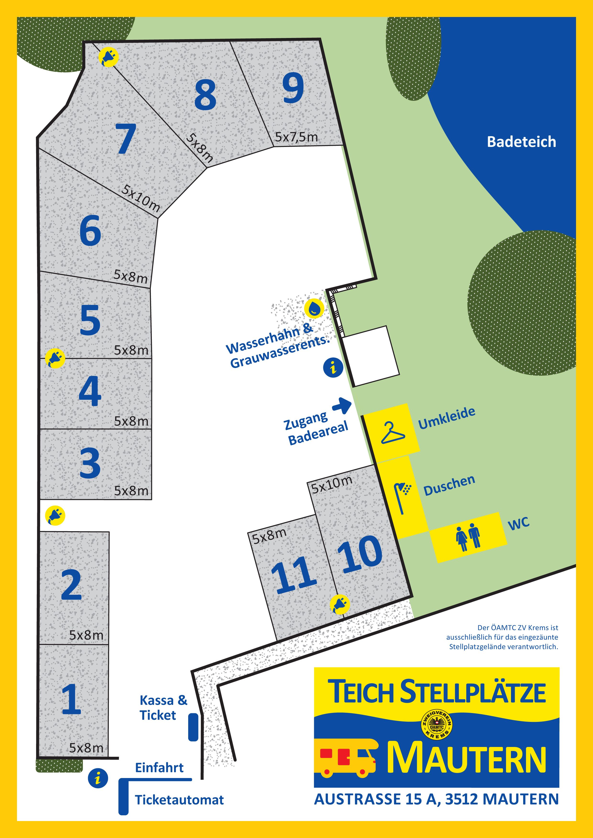 There are 11 motorhome pitches available at the site in Mautern an der Donau. The pitches are located in a fenced area with access to the Mautern bathing pond. There are toilet facilities, a shower and a bathing buffet in the public area. There is also a children's playground and several local shops in the immediate vicinity.
