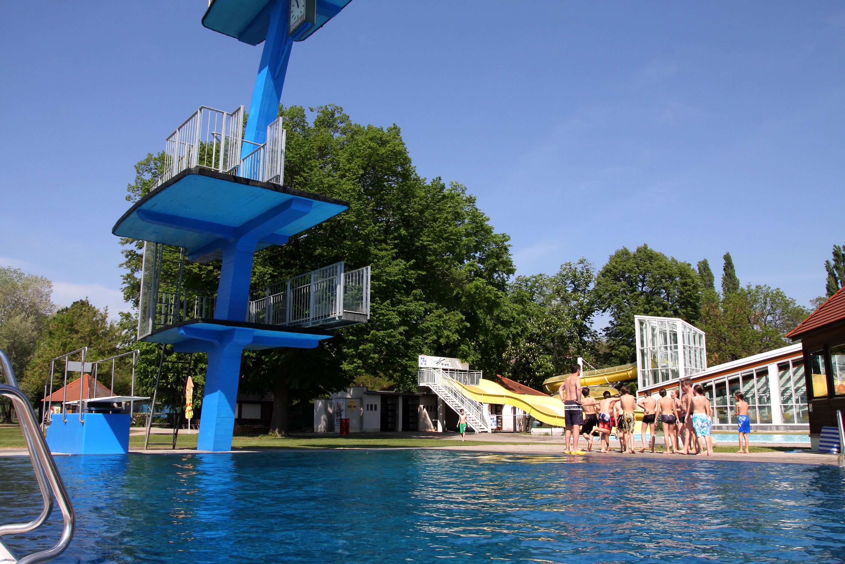 The summer pool offers a 50-metre sports pool, 20-metre non-swimmers' pool, diving pool (3.80 meters deep), diving tower with finish pool, 15-metre wide slide with finish pool, heated outdoor pool of the indoor pool, children's area with two slides, a play stream and a children's playground, baby changing room, 3 beach volleyball courts, table tennis and ball games area. The slide in the indoor pool can also be used from the summer pool.