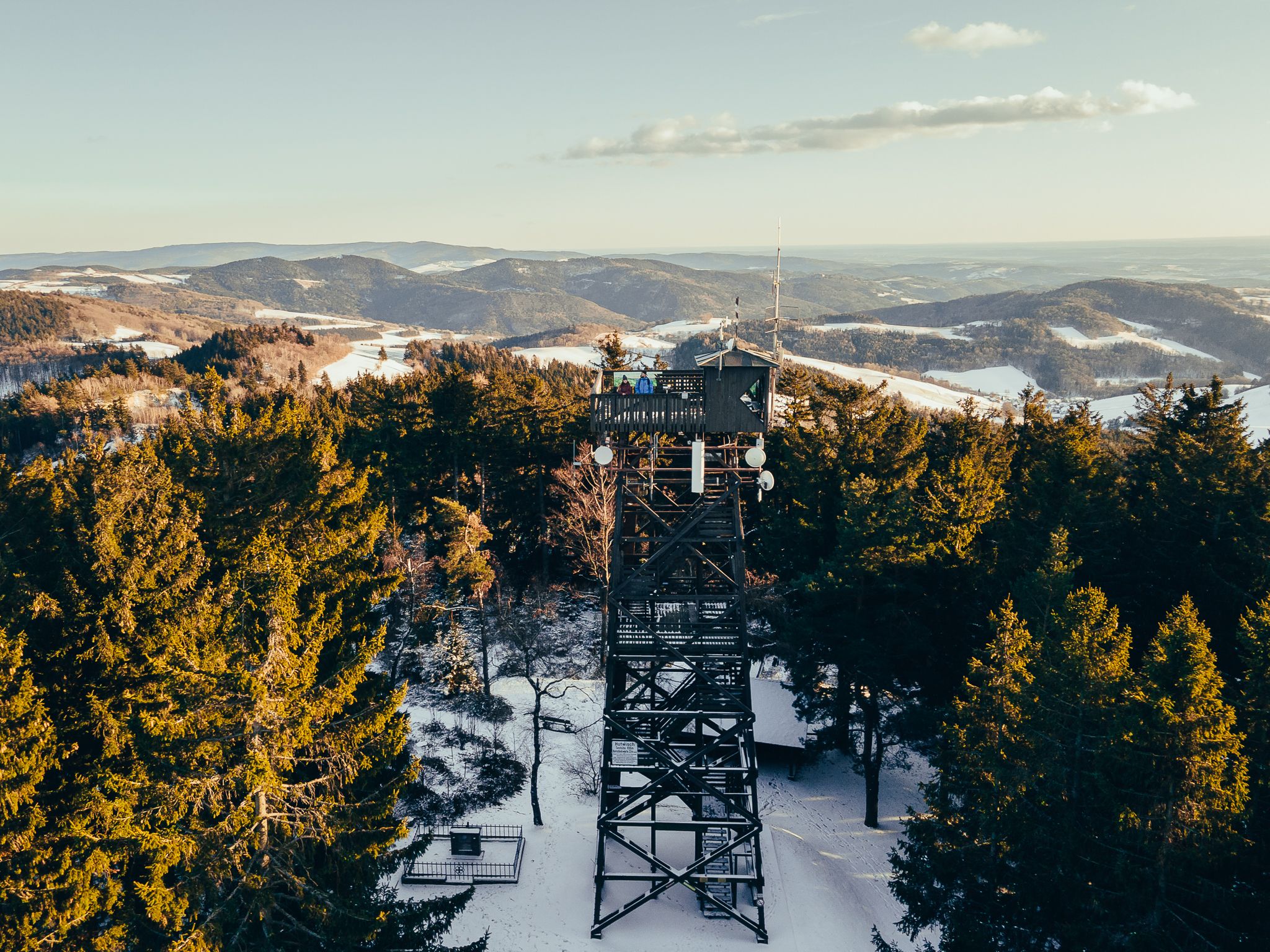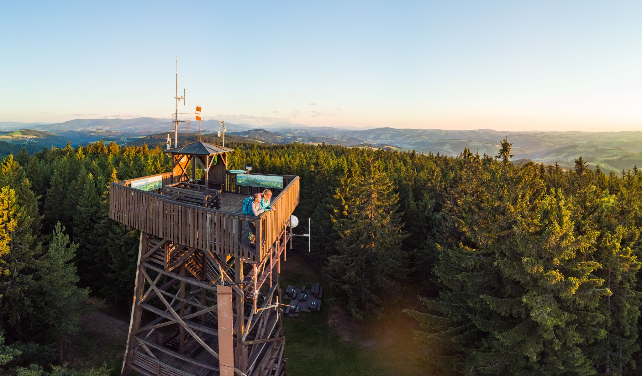 A breathtaking view awaits visitors on the platform of the viewing platform on Hutwisch, which at 896 meters is the highest point in the Bucklige Welt. From here, the view sweeps far over the rolling hills of the region, the foothills of the Alps with the Wechsel and Schneeberg mountains - and even as far as Hungary and Slovenia on a clear day.