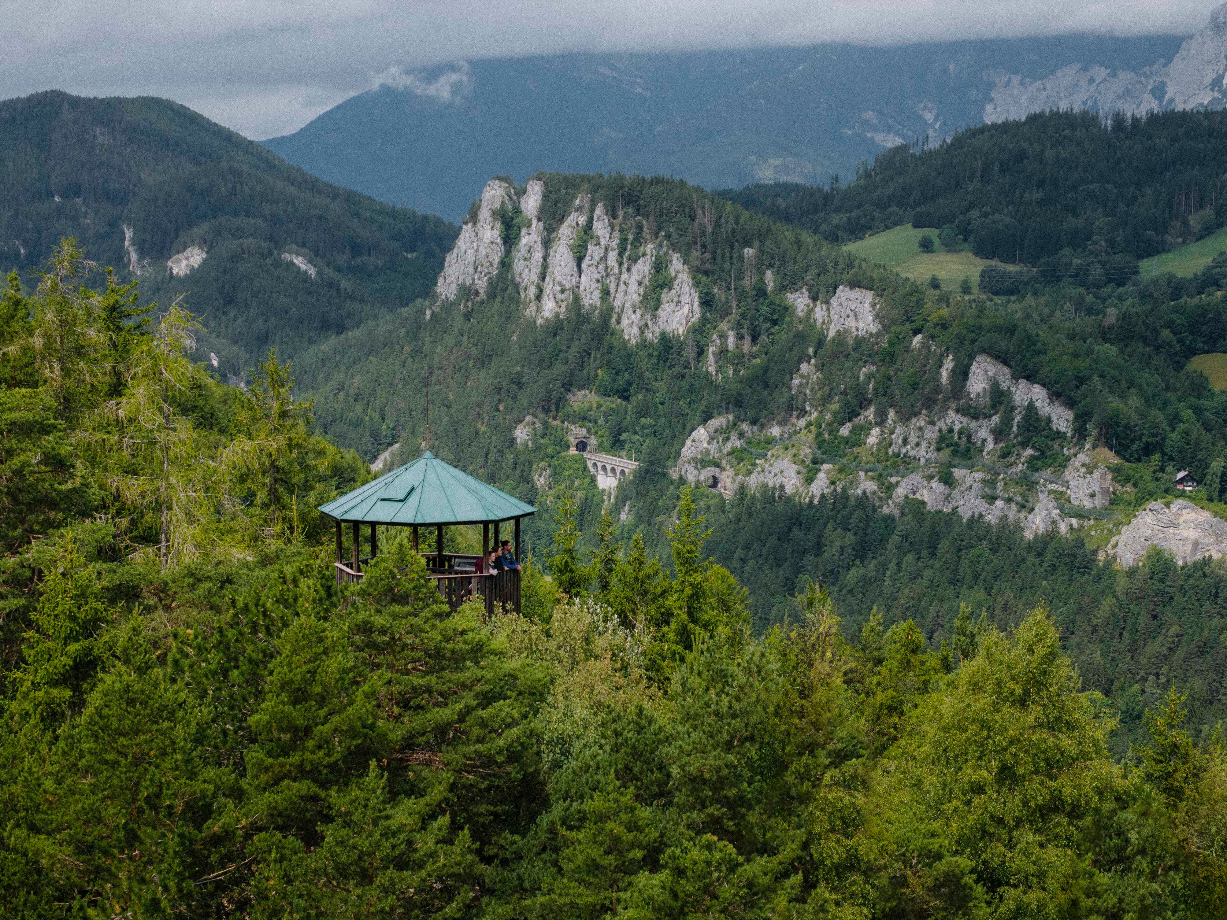 The Doppelreiter viewing platform is located at an altitude of 919 meters on the Wolfsbergkogel on the railroad hiking trail that runs along the Semmering Railway in the municipality of Semmering. Just a few minutes' walk from the "20 Schilling" viewing point, it offers breathtaking views of the UNESCO World Hertige site of the Semmering railway and the surrounding area. There is also a train stop just below the Wolfsbergkogel viewing platform.