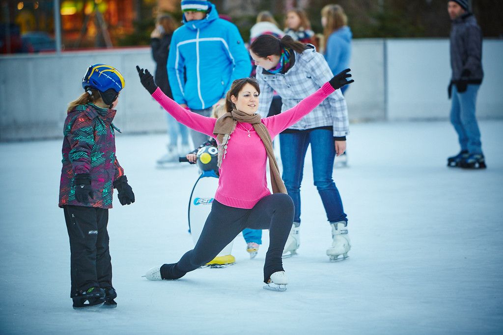Ice disco, ice skating courses and ice hockey training sessions take place weekly on an area measuring 38 x 27 meters. Admission is free for children up to the age of 6. Ice skates and learning aids for small children are available for a rental fee.