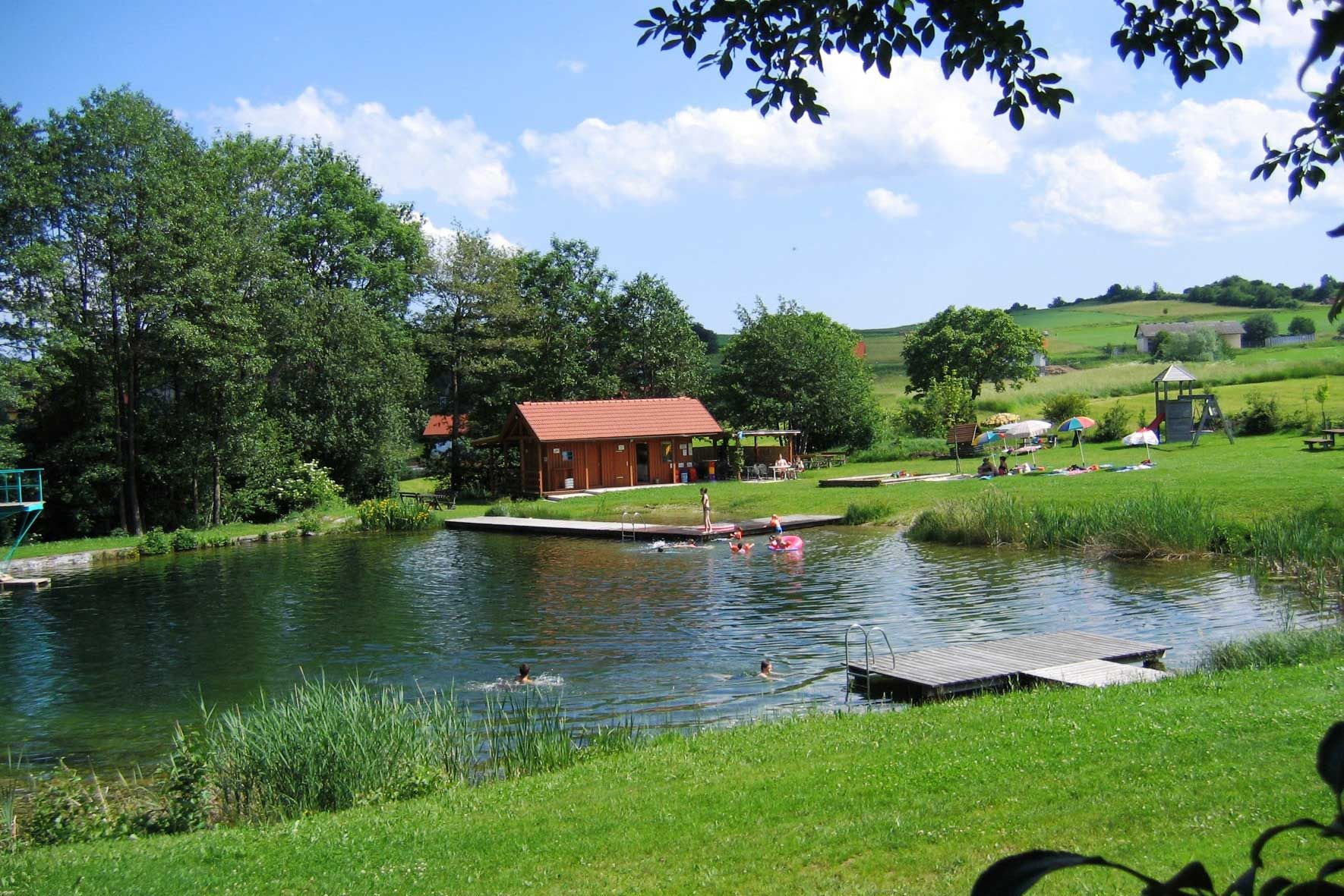 Natural swimming pond with large sunbathing lawn, diving platform, floating jetty, children's swing, buffet service (in good weather), quiet water area