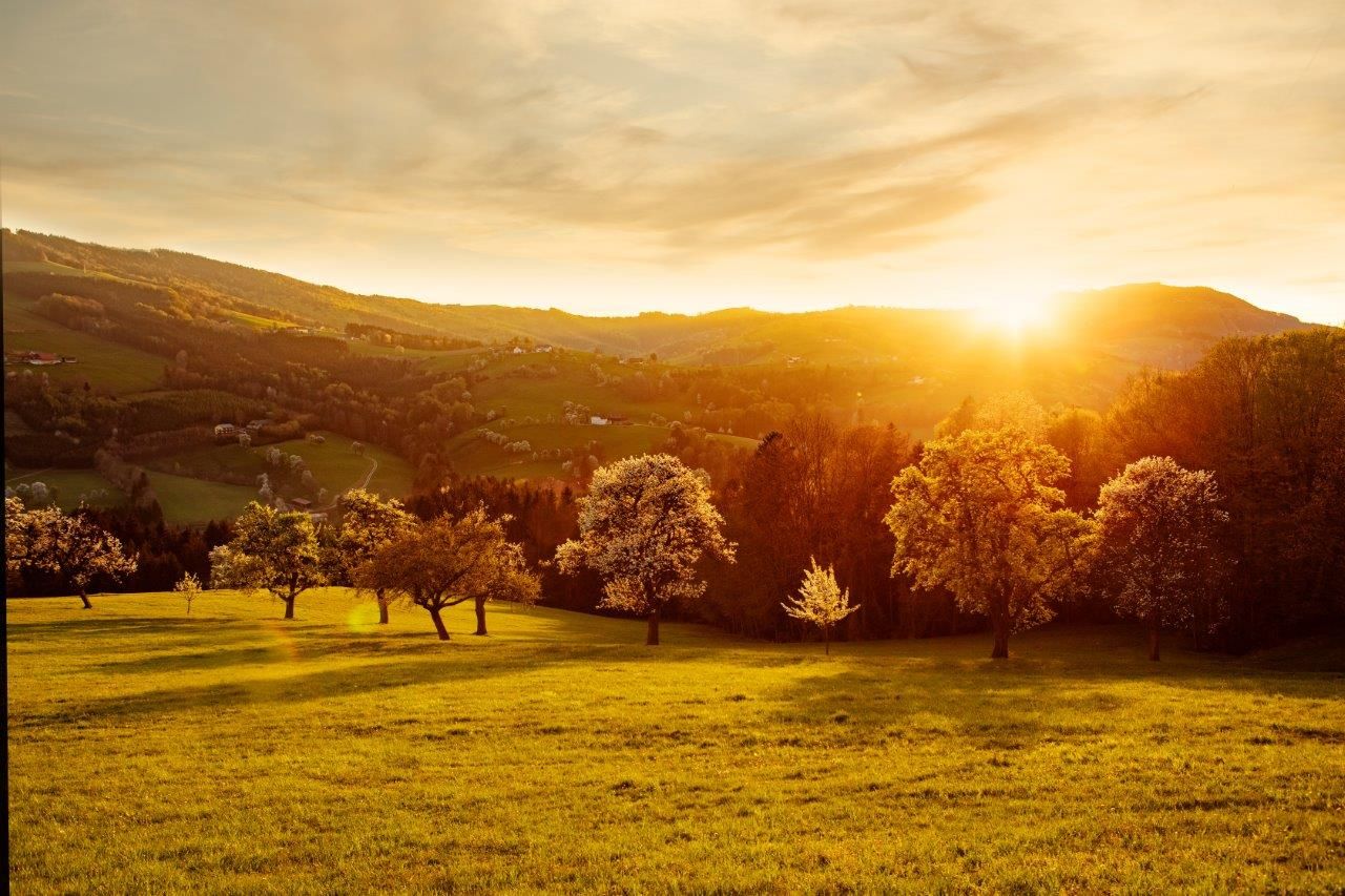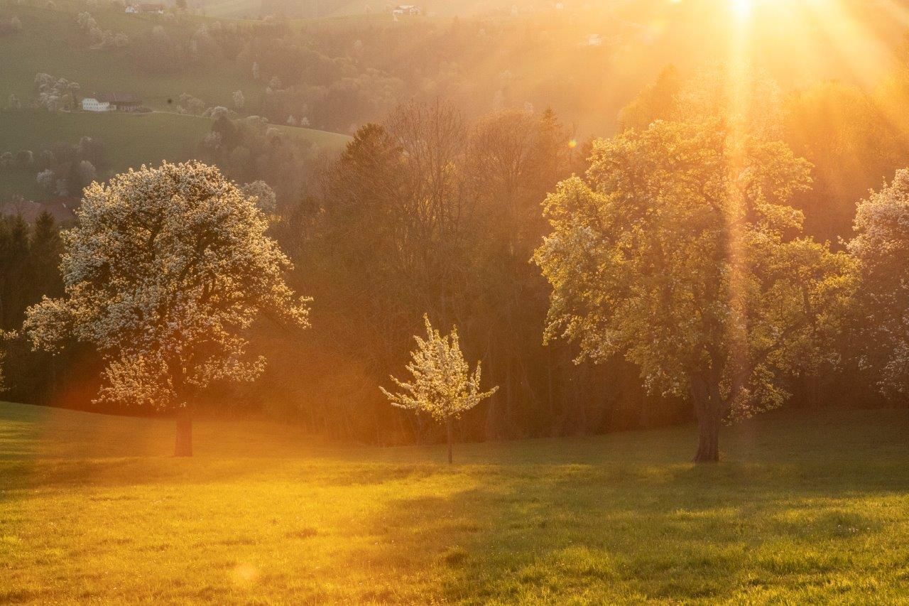 The blossoming pear trees reflect the rich evening red. This romantic sunset atmosphere is ideal for a picnic or a short break.
