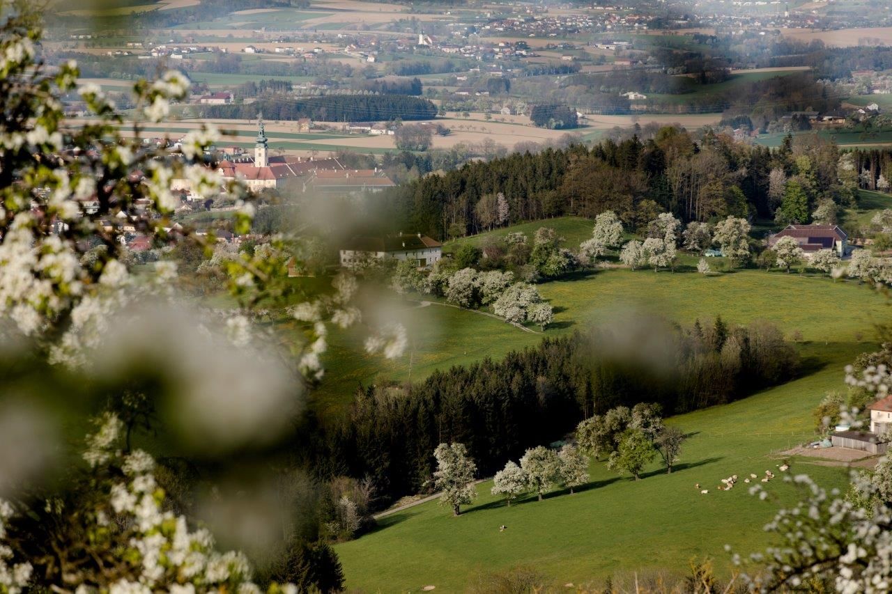 You can see Seitenstetten Abbey between the blossoming pear trees.