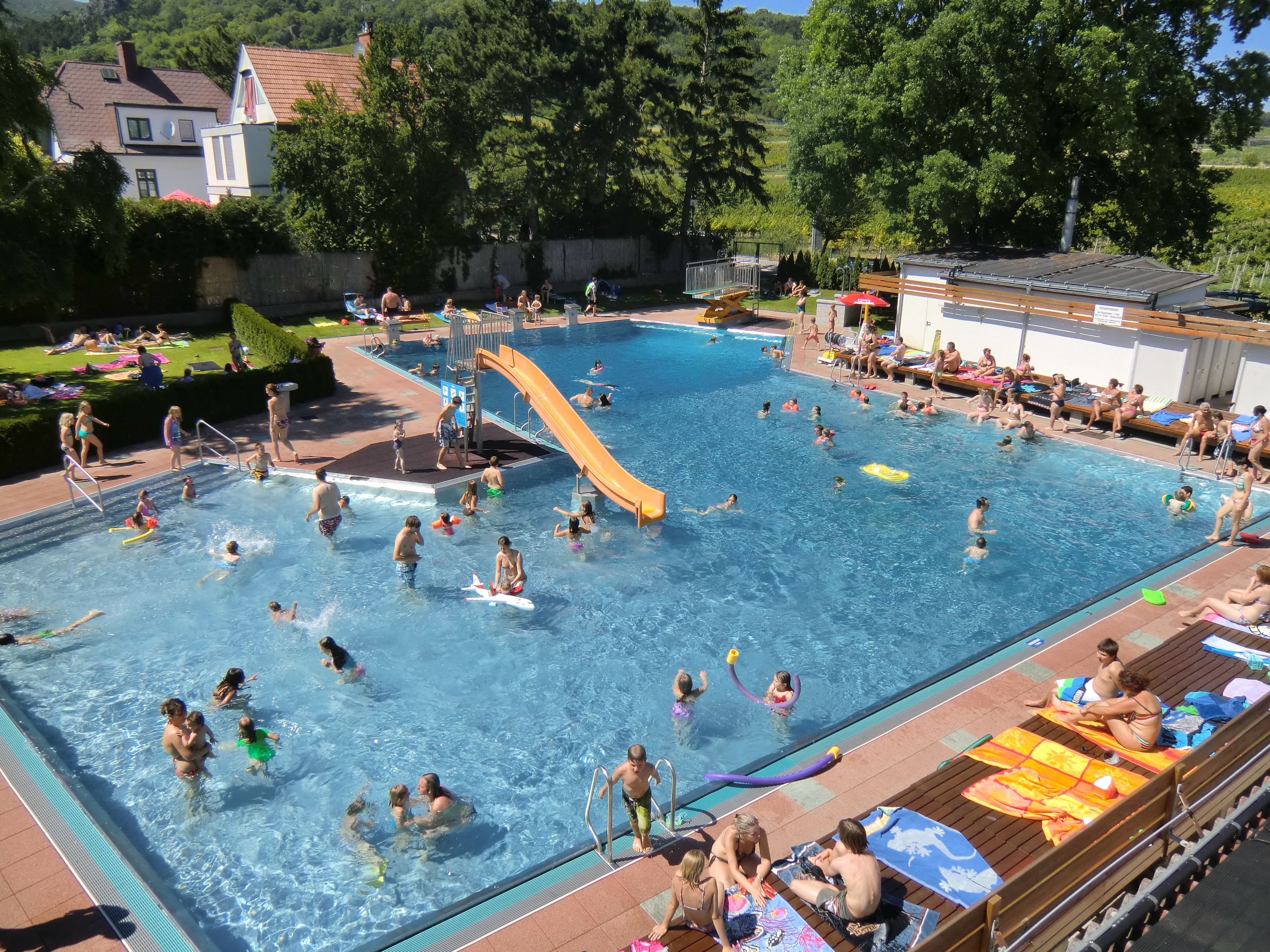 The Gumpoldskirchen outdoor pool offers swimming fun for all ages: Multifunctional pool with height-adjustable diving board, water slide and a toddler pool with shade, where the little beach boys and girls can make their first contact with the cool water, as well as a playground.