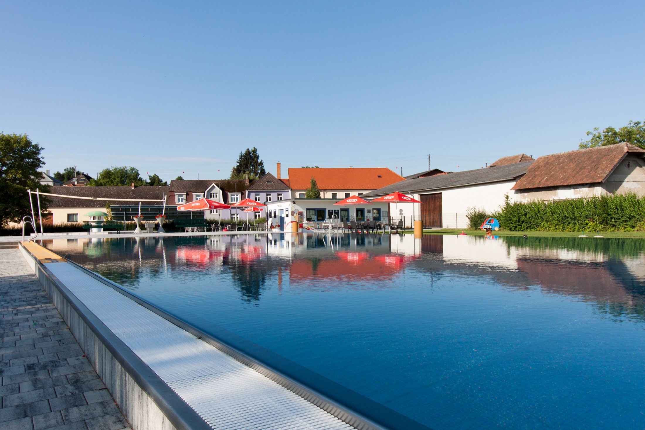 In the summer months, this is a meeting place for young and old. Depending on the weather, the outdoor pool is open from the end of May or beginning of June to the end of August.