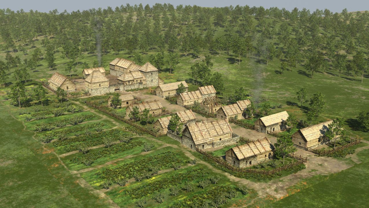 When the stone house was abandoned around 1240, a cul-de-sac village was built about 100 meters south of it. The ten houses faced each other in two rows on the gable end. At the southern end was a village square with a spring, adjoined by a manor house. The farmhouses were wooden buildings on dry stone foundations. They were two-roomed (residential storage buildings), three-part with a central entrance room or with an adjoining stable. They were heated and cooked on a ground-level hearth or a domed oven. According to finds, a (blacksmith's) forge worked in one of the houses.