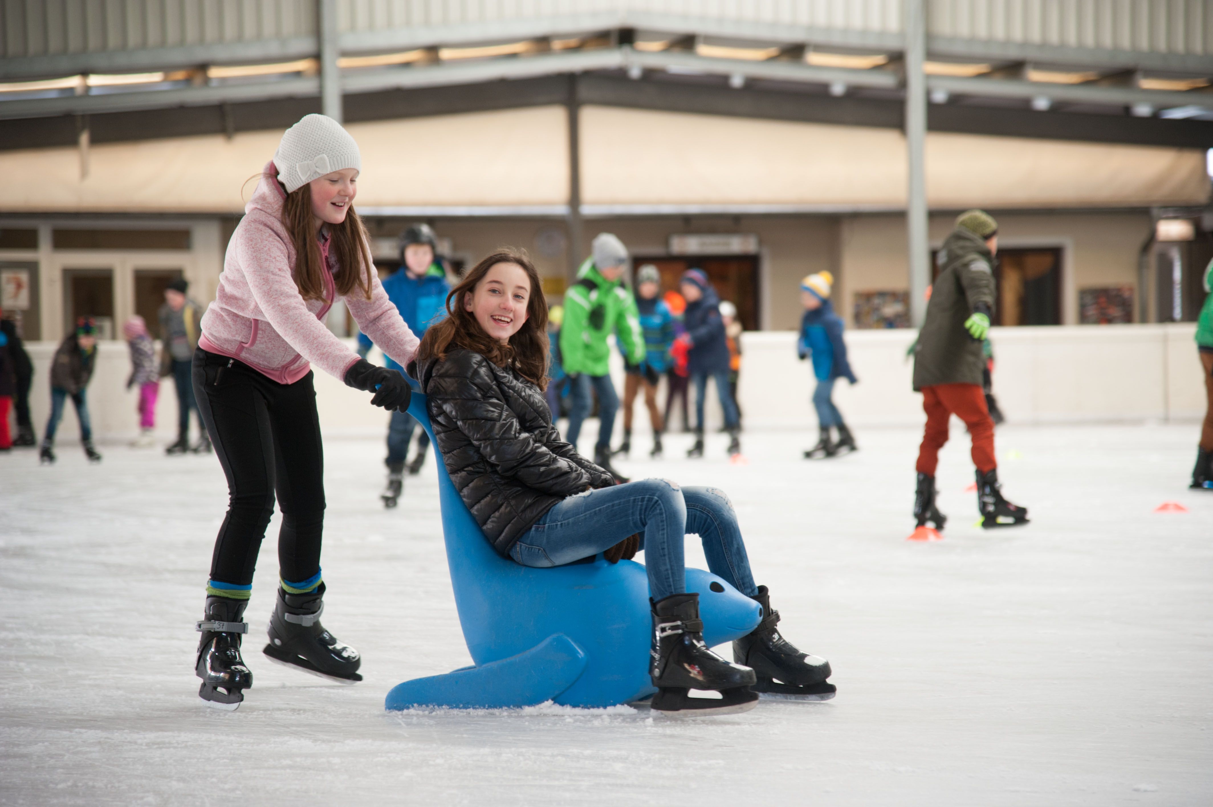With upbeat music and a buffet, you can spend a few hours there. Adjacent to the artificial ice rink are several large trampolines where children can really let off steam. There are ice skating aids in various sizes for the little ones. Ice skates for hire on site!