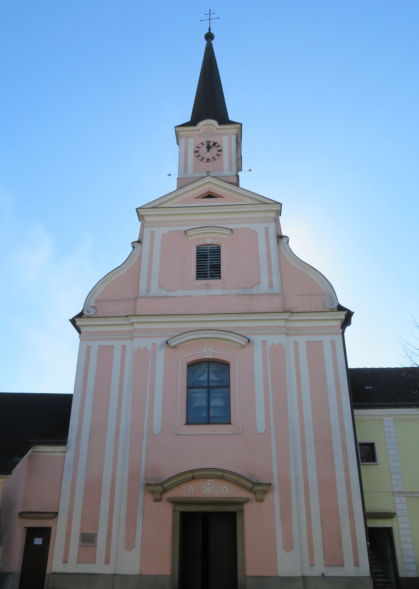 The nave has two bays and is adjoined by a three-stage raised, almost square choir with a round apse niche. On the east side of the choir is a late-Baroque sacristy door. Above it is a segmental arched four-light oratory window with a fanlight and ornamental stained glass panes.