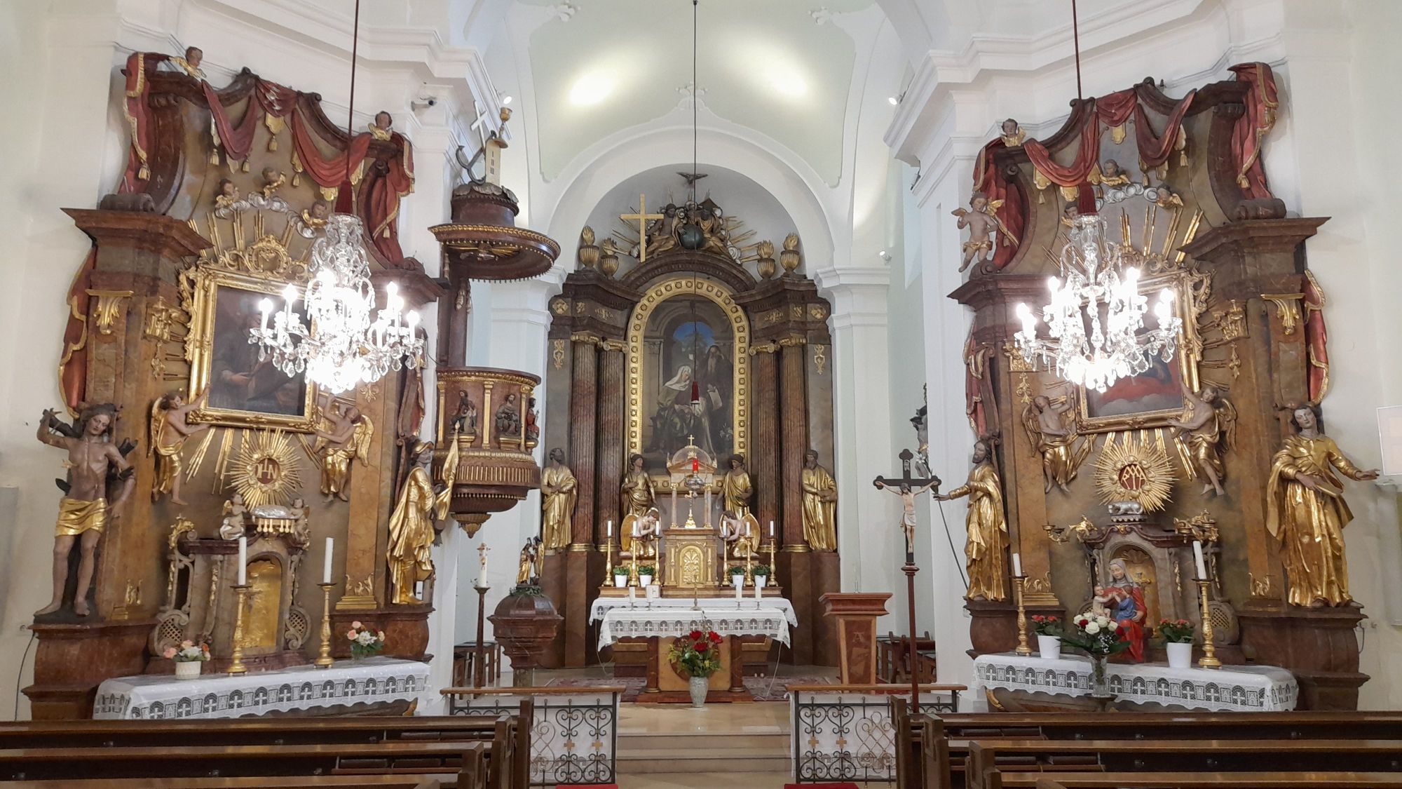 The two side altars in late Baroque style date from the 18th century. The left side altar, with the statues of St. Sebastian and St. Florian, is dedicated to St. John of Nepomuk. (The right side altar is called the Marian altar. Next to the "Mariahilfbild" are the statues of St. Joseph and St. John the Evangelist.