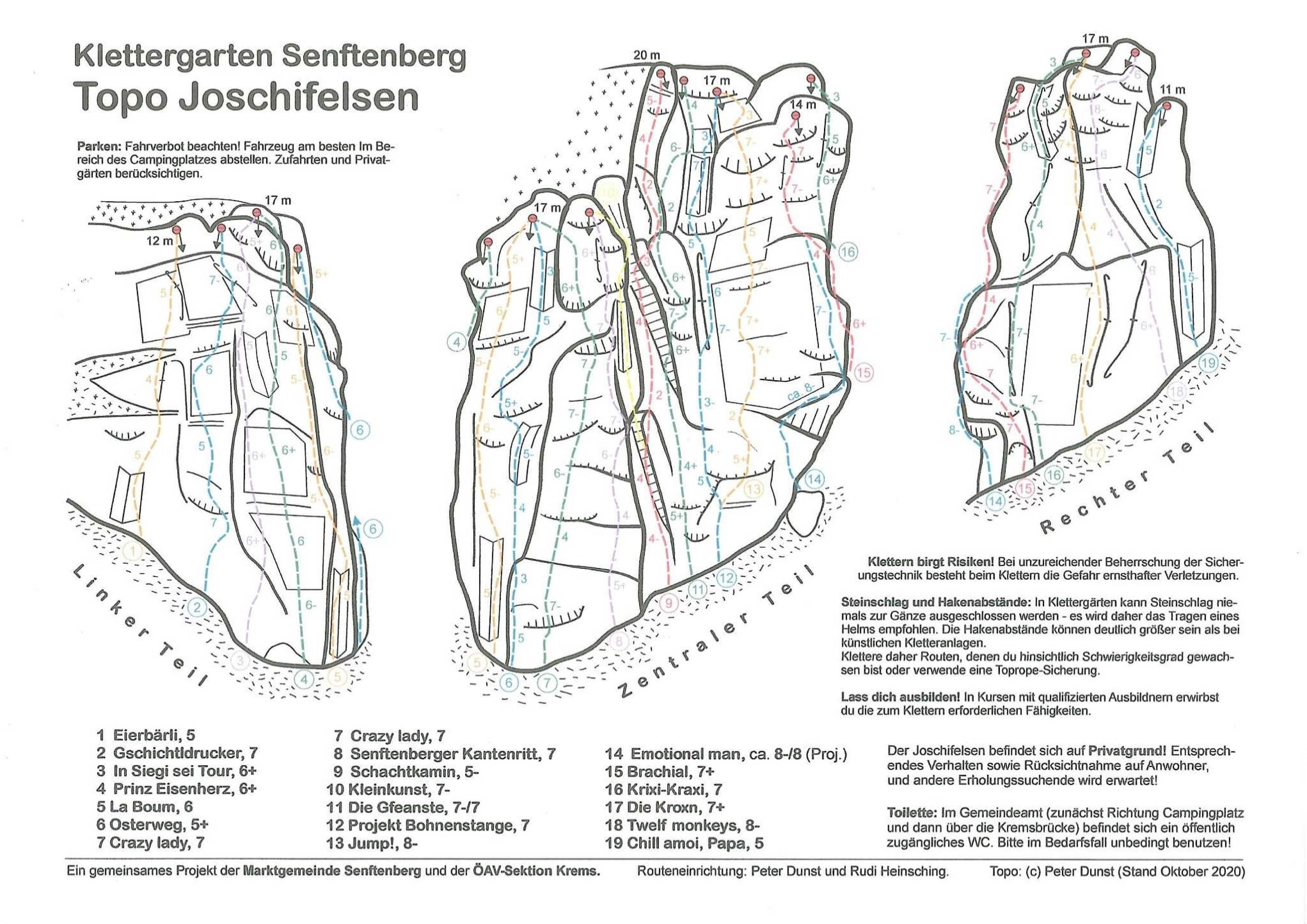 The Krems section of the Alpine Club (ÖAV) has taken over the maintenance and also sponsored the costs for hooks and equipment. The "Joschi Rock" is located directly above the Krems river in the Hiesberg street opposite the Wieland joinery.