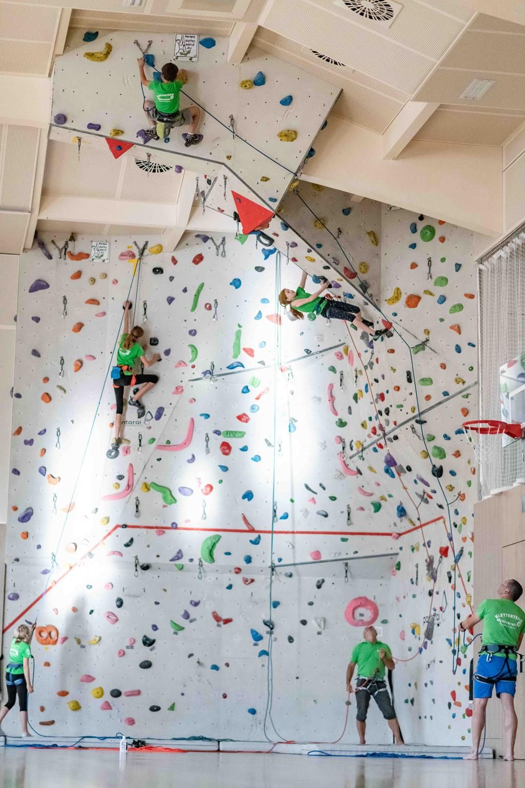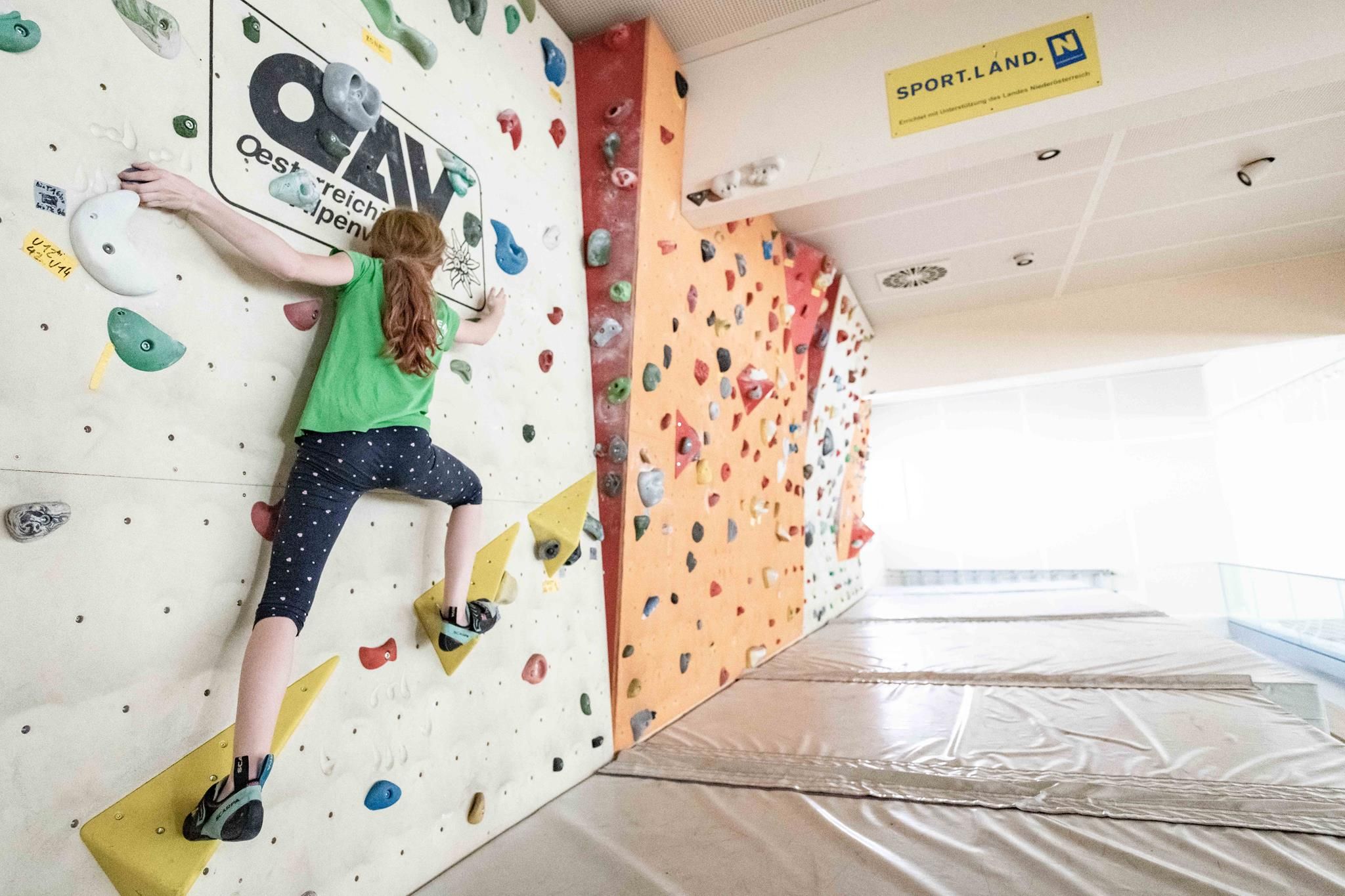 The climbing and bouldering wall in the Carl-Zeller-Halle in St. Peter in der Au offers 120 m² of lead climbing area (partly top rope) at a wall height of 8 m as well as a separate 100 m² bouldering area.