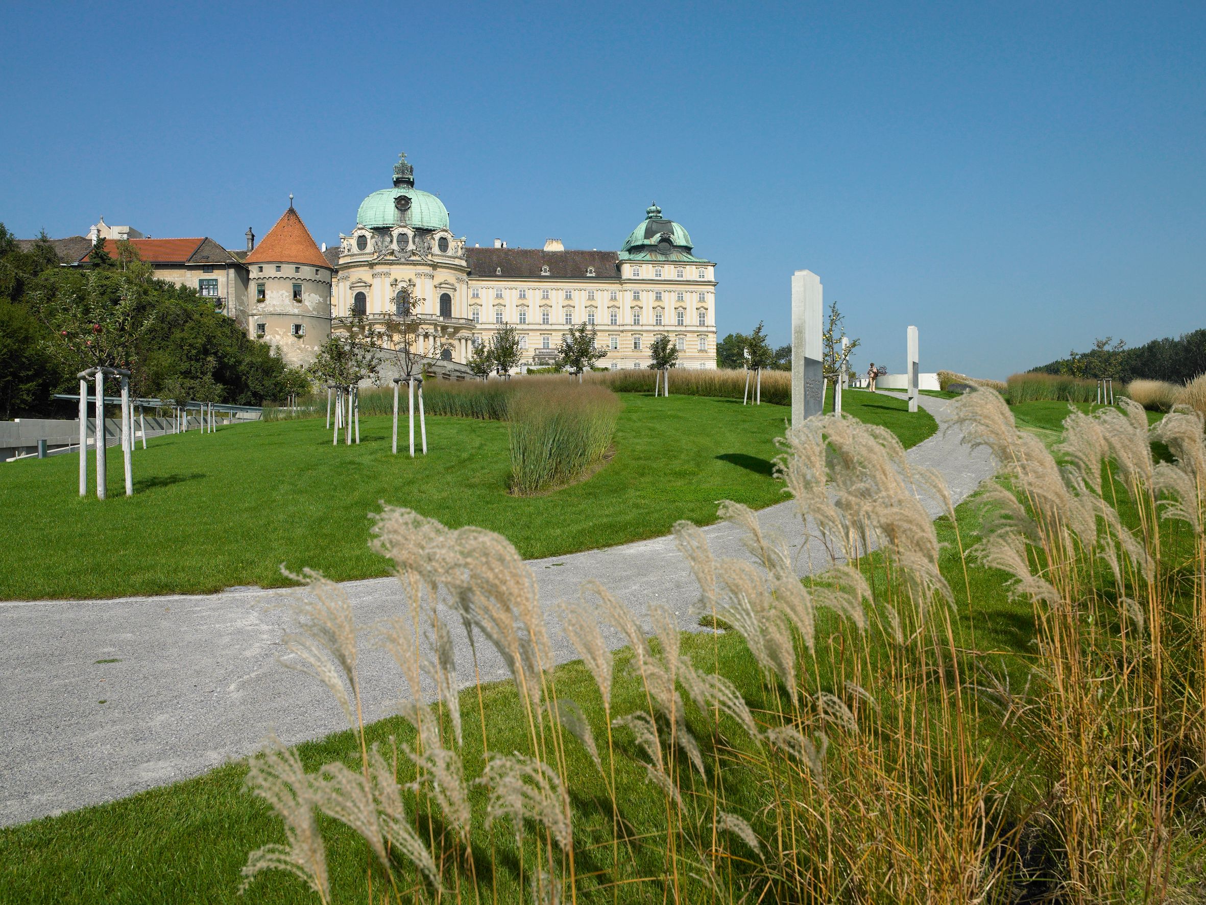 As soon as you enter Stift Klosterneuburg Abbey through the Sala terrena, the view of the abbey's diverse garden landscape opens up. The modern pond garden, in which thousands of flowers and grasses are arranged into a biblically inspired "lily of the field", forms the prelude. A deliberate contrast to this is the convent garden, which was laid out in the 19th century in the English style on what was then the banks of the Danube. It served the canons as a place to relax and today is home to one of the largest ginkgo trees in Austria, the neoclassical orangery by Joseph Kornhäusel and a fountain.