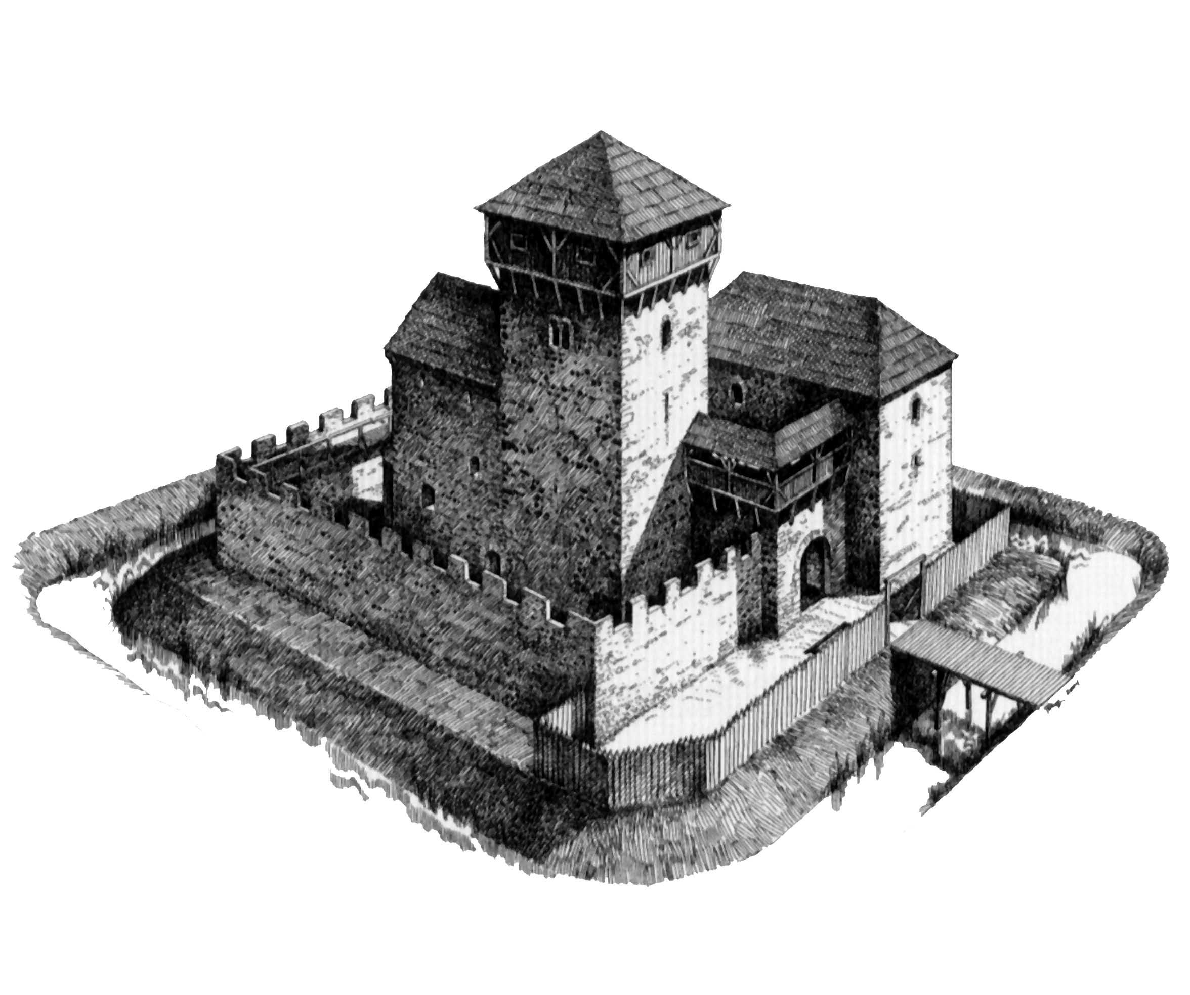 The mighty keep with sides almost 9 m long and walls over 3 m thick was built in the second half of the 13th century. The once multi-storey tower was placed over the western section of the chapel and now formed a single structural unit with the shortened sacred building. A curtain wall with a moat was built in the 14th century. The palace was moved to the north-west of the site and the chapel area was used as a cemetery, where over 900 burials were excavated