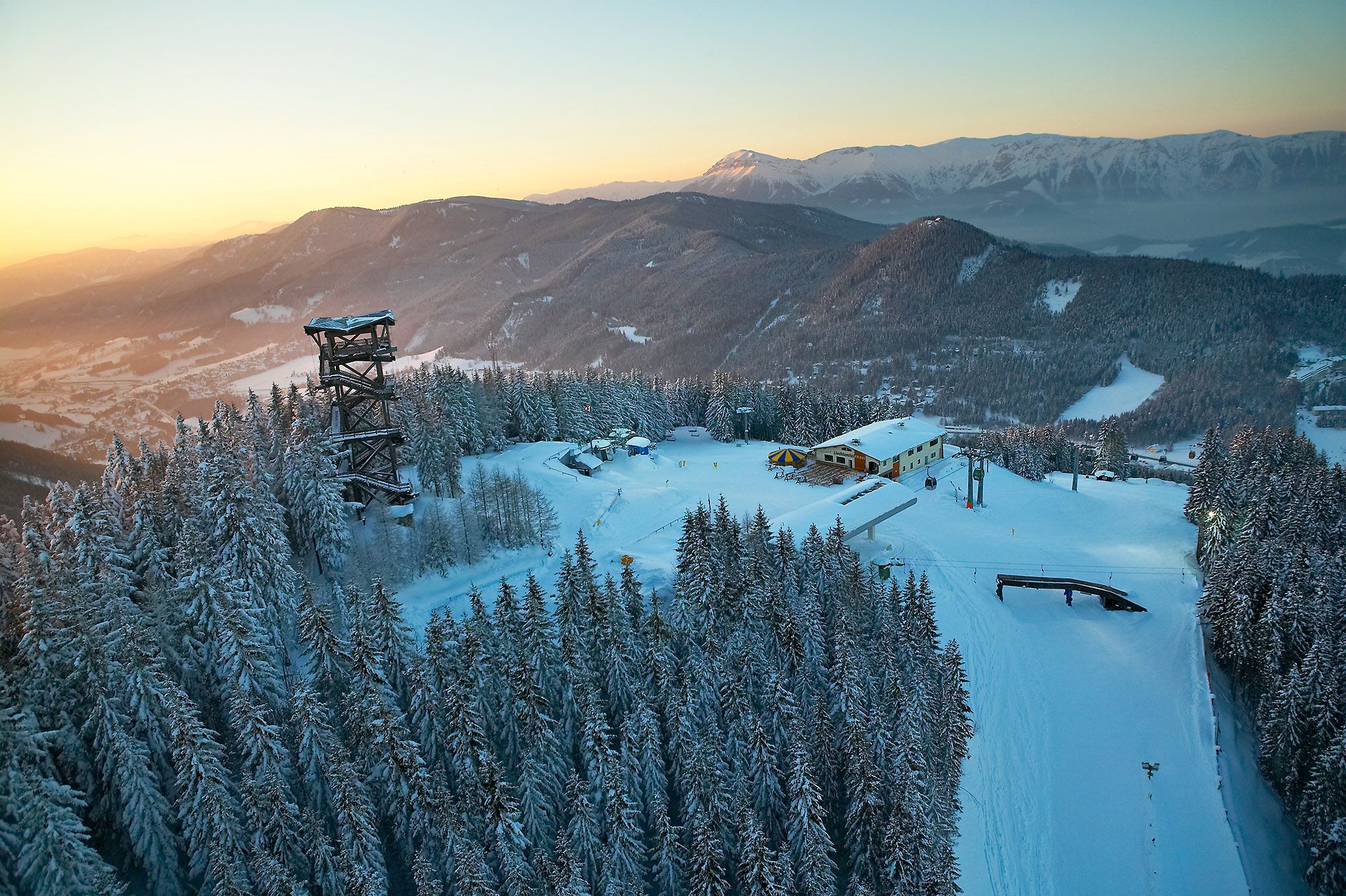 The Millennium Observatory is located at the highest point of the Hirschenkogel at 1,340 meters. From the 25-metre-high viewing platform, you can look out over the Semmering-Rax massif and, on a clear day, see as far as Hungary.