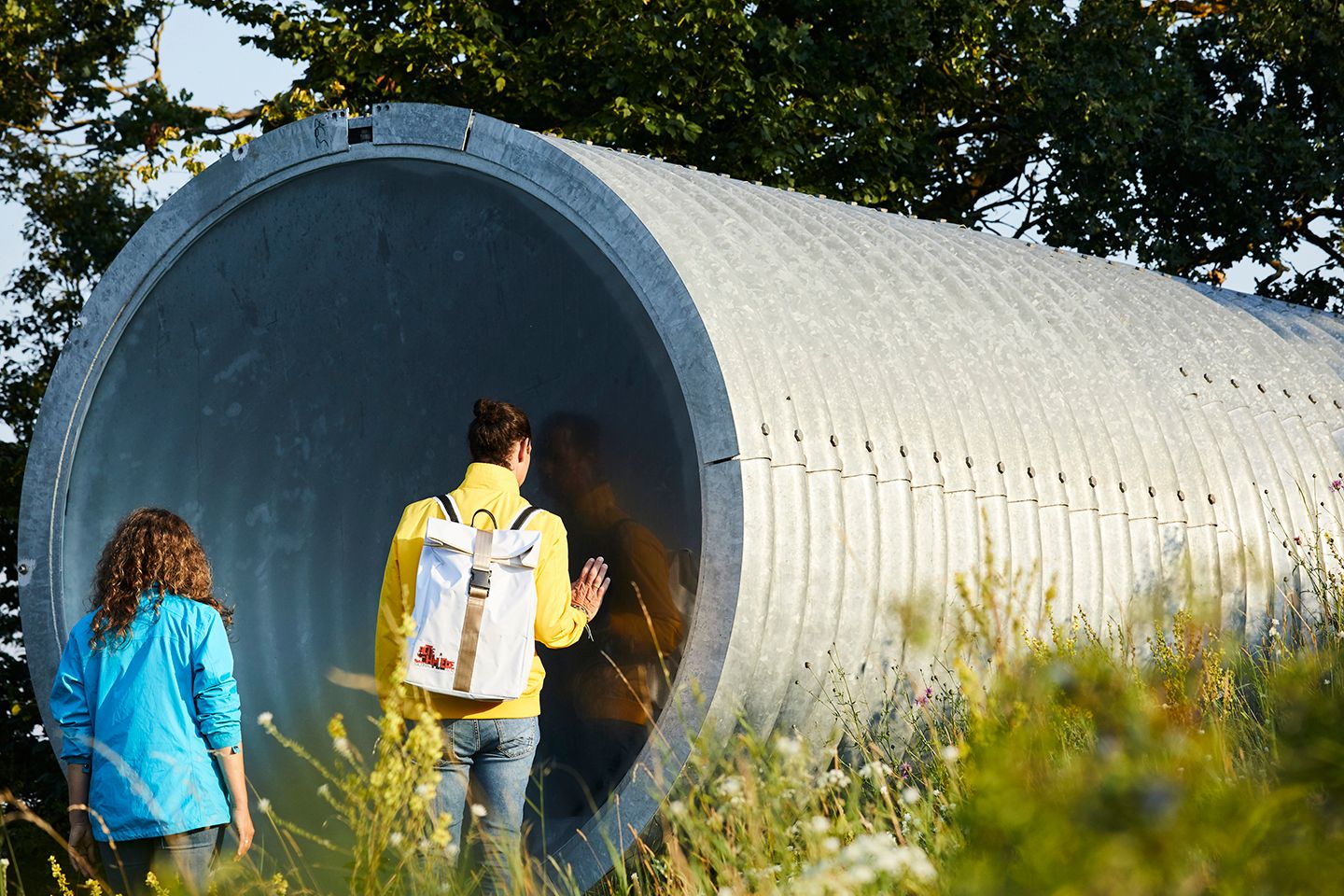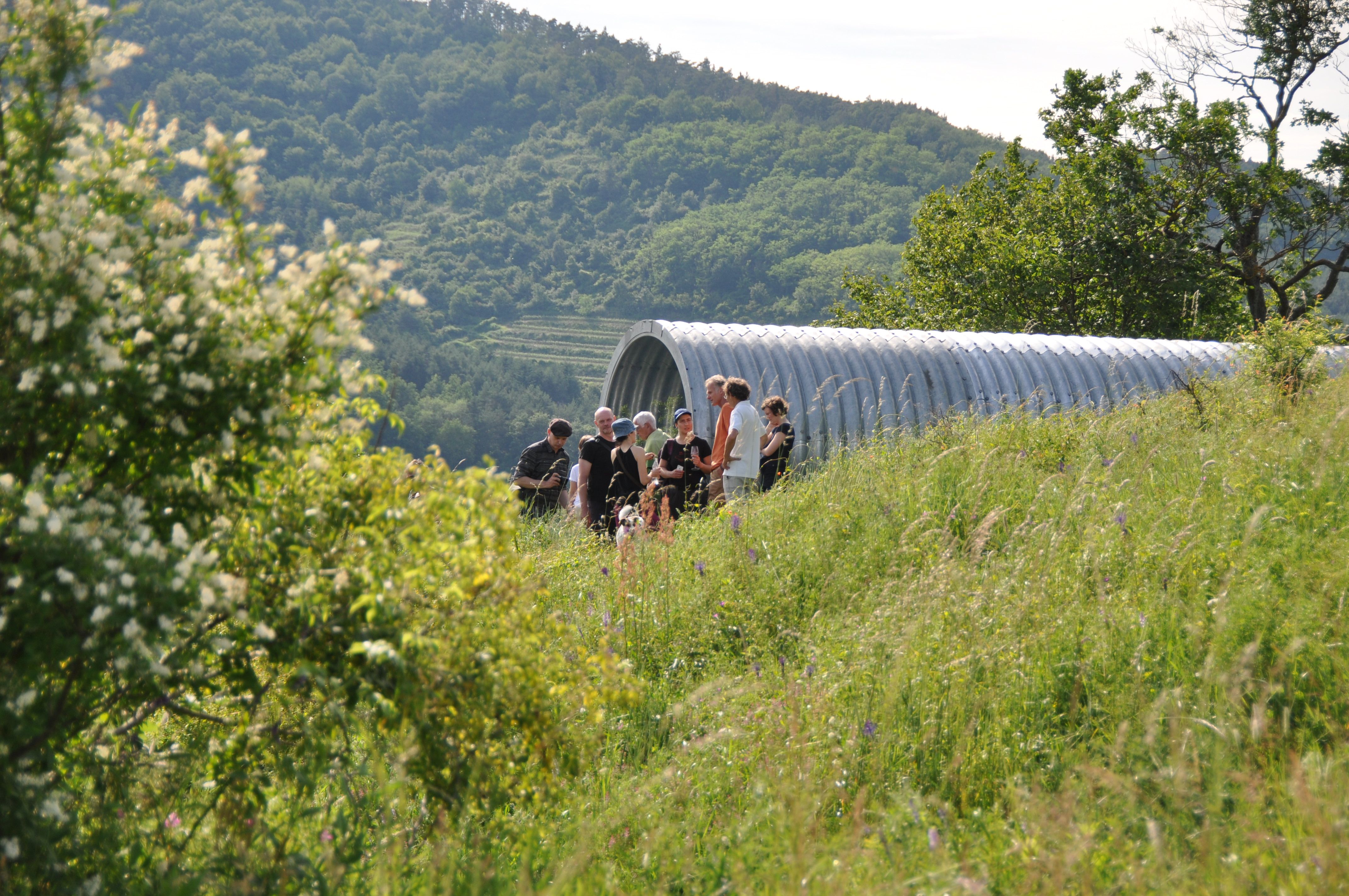 Herbert Golser erects the so-called "Moon Tube" - a corrugated steel tube made of galvanized steel with a length of 12 m and a diameter of 2.5 m on the ridge of the Kalvarienberg. The tube is sealed on both sides with safety glass.