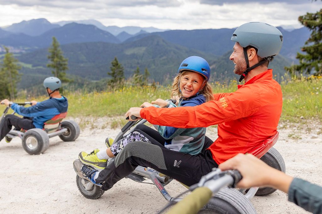 Please note: For safety reasons, children under the age of 4 are not allowed to ride the mountain carts. Children between the ages of 4 and 8 ride for free with an adult. 6 to 8-year-olds only pay for the lift ride. From the age of 8 AND a minimum height of 140 cm, children are allowed to drive a mountain cart themselves. A helmet is compulsory.