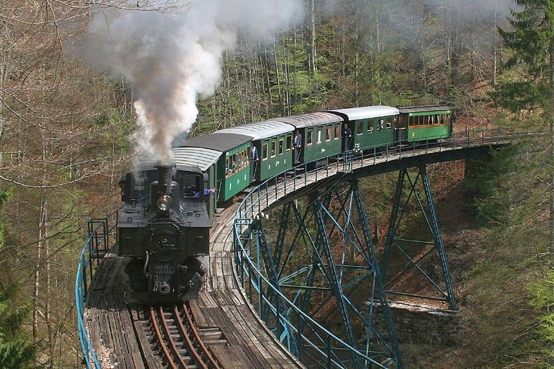 On the journey with the Ötscherland Express from Kienberg-Gaming, passengers can expect a journey where speed is not an issue. The museum train chugs leisurely along the mountain route of the Ybbstalbahn past the historic Gaming Charterhouse, over two viaducts built using the trestle construction method, of which there are only three in Austria, to Pfaffenschlag.