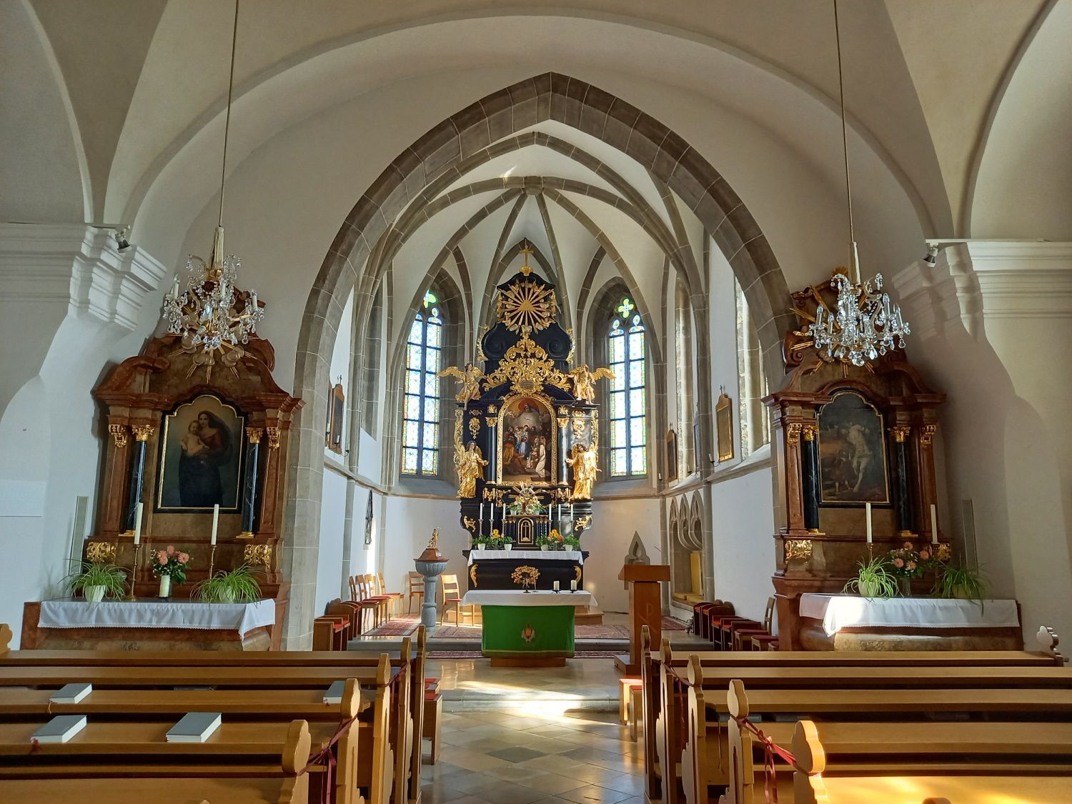Particularly worth seeing are the Gothic pulpit, the 17th century wall fresco and the Gothic presbytery with the Gothic "session niche". An ancient Celtic stone was found near the fortified church during an excavation in 1973.