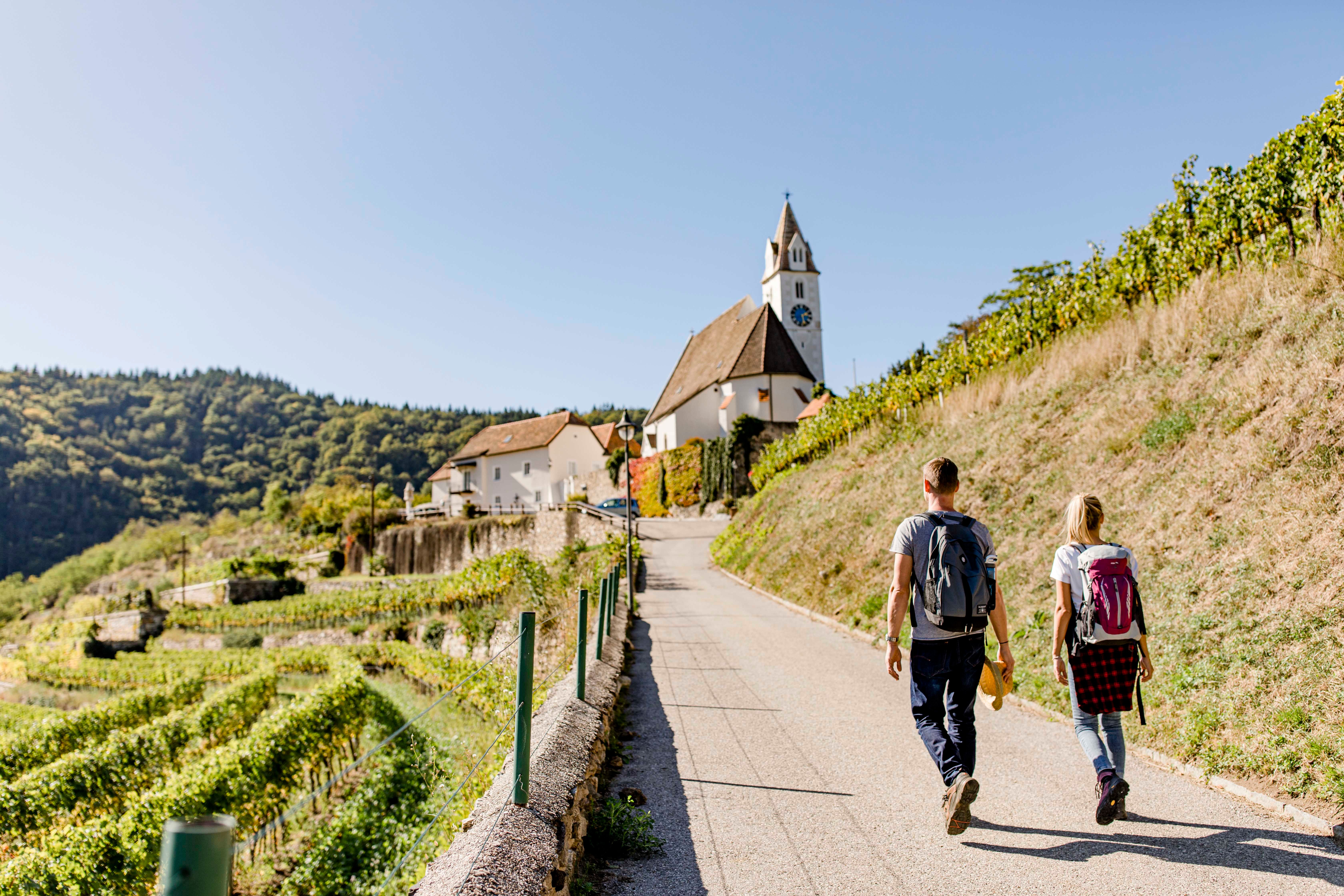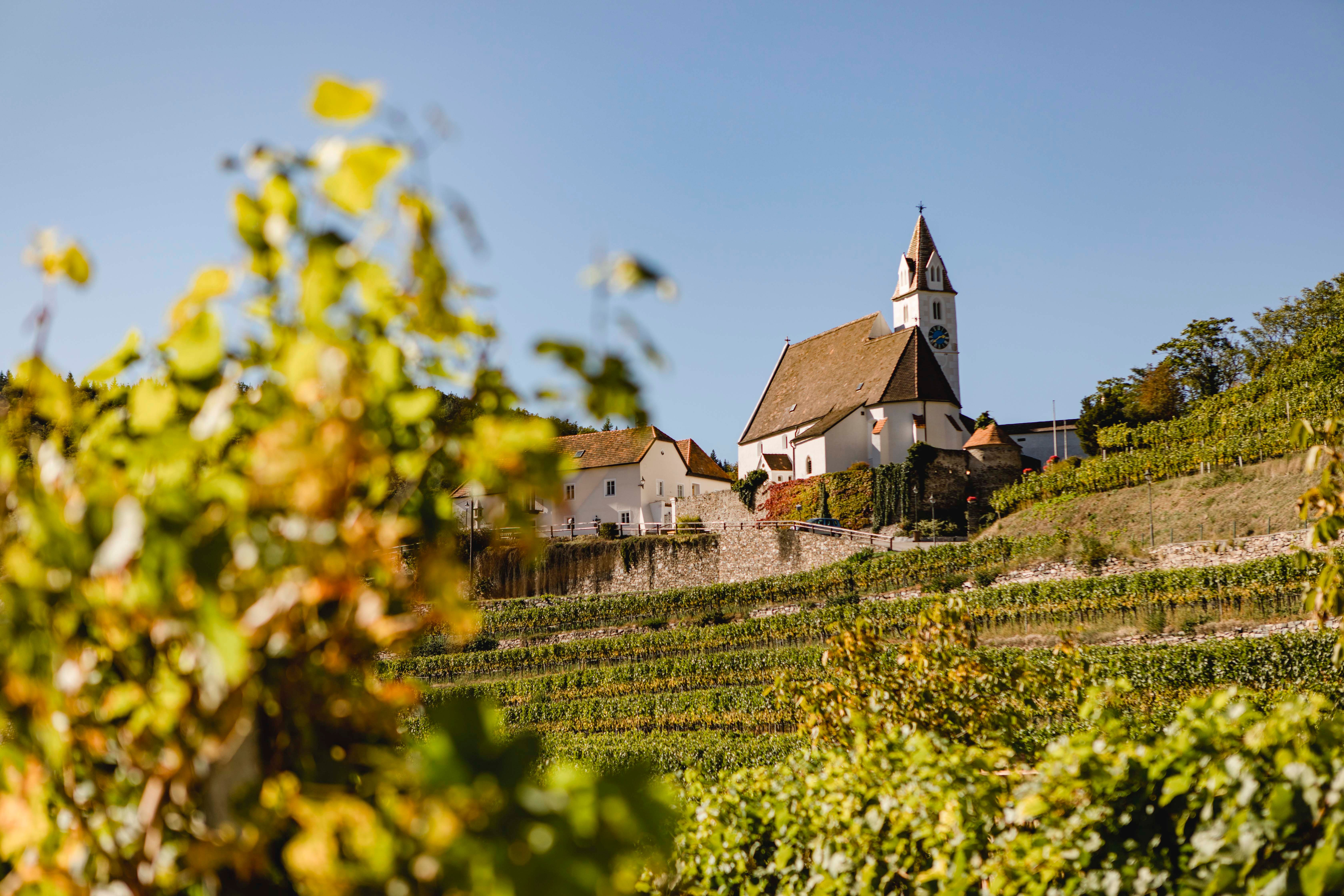 The interior was largely baroqueized in the 18th century. Significant parts of the decoration come from the school of Kremser Schmidt. The church is surrounded by a well-preserved medieval defensive wall, with a covered passage connecting it to the castle hill.