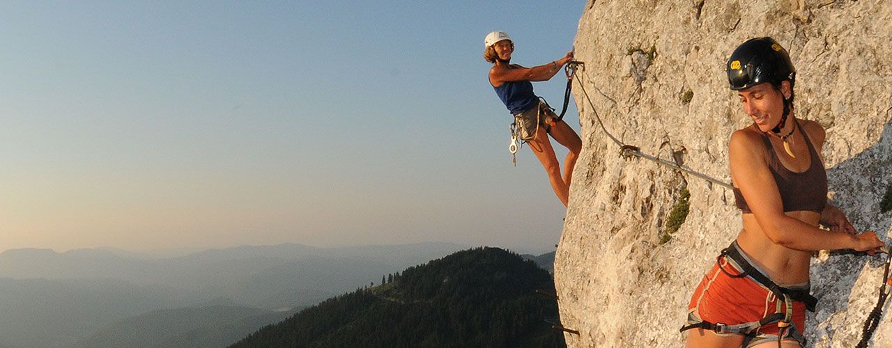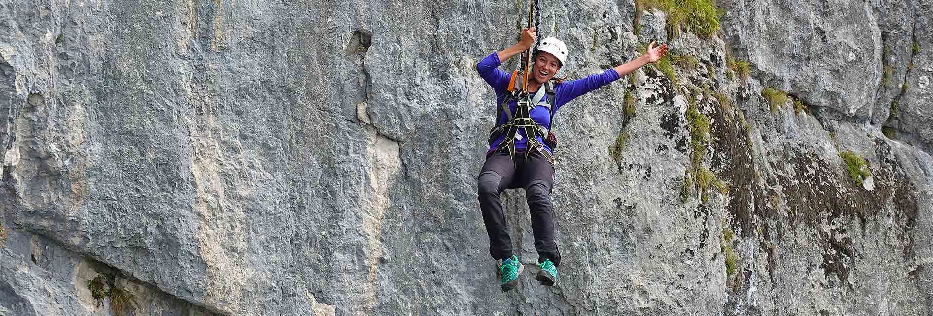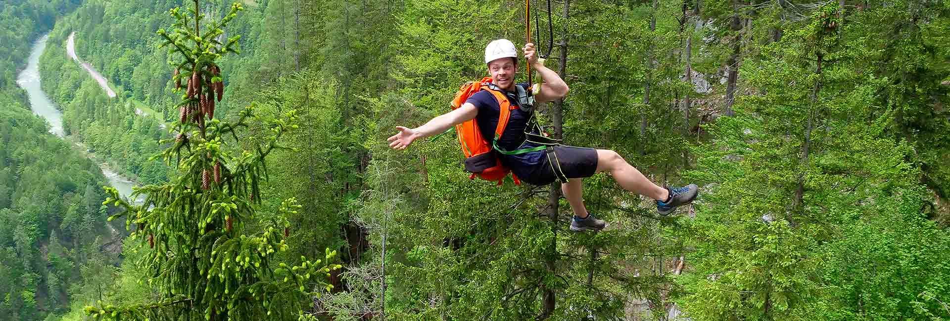 Our guided via ferrata tours offer the opportunity to get to know the vertical alpine terrain while being well secured. It's fascinating to climb a rock face and experience breathtaking views. It is impressive to experience the mountains in this way. Before the via ferrata tour, there is a detailed introduction to the climbing harness, the carabiners and how to use them correctly. You climb through the rock face along the safety rope. The via ferrata is equipped with handholds and stirrups to make climbing up easier. It is an exciting mountain tour that will leave you with unforgettable impressions!Flying Fox Alpine