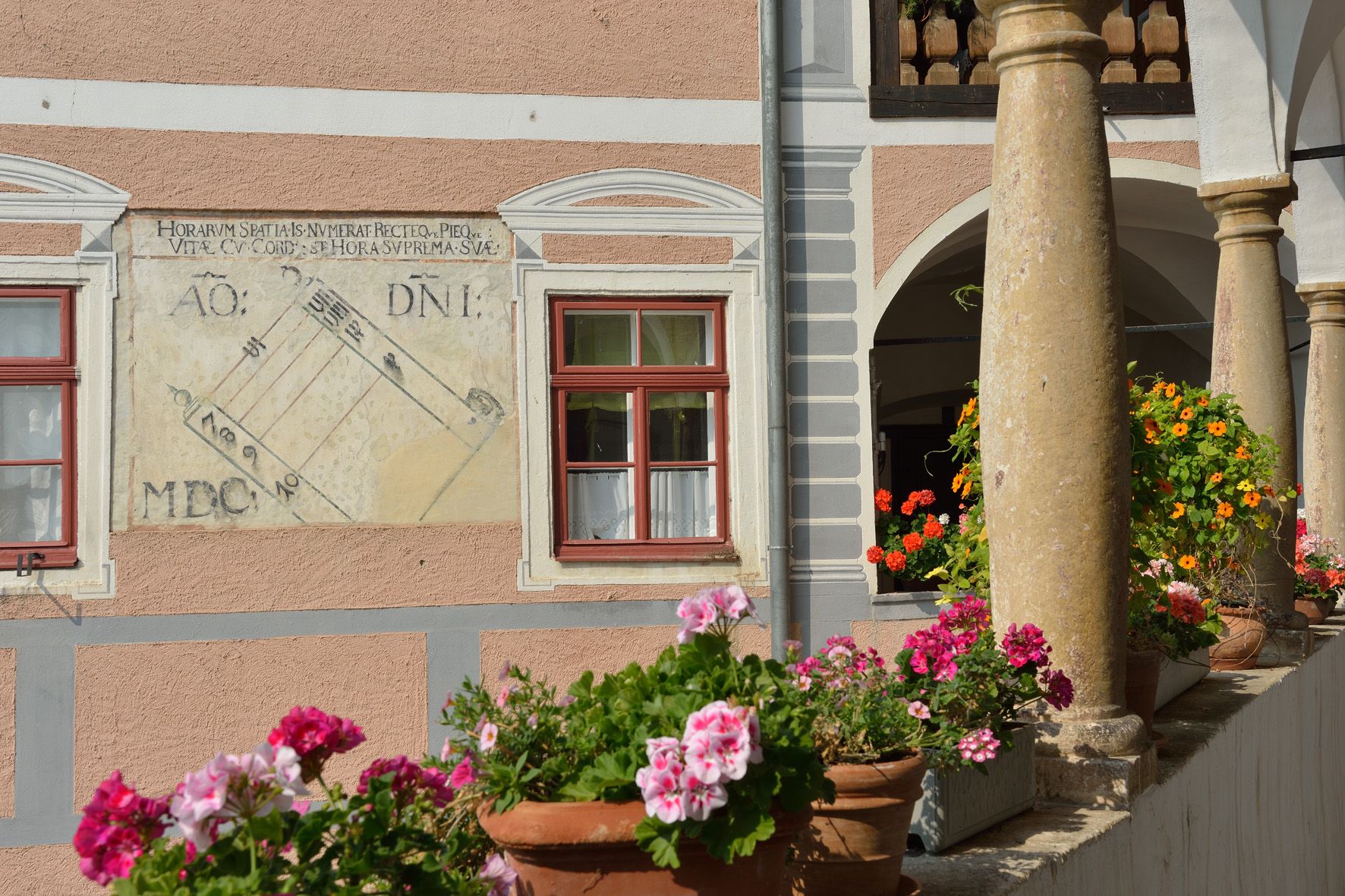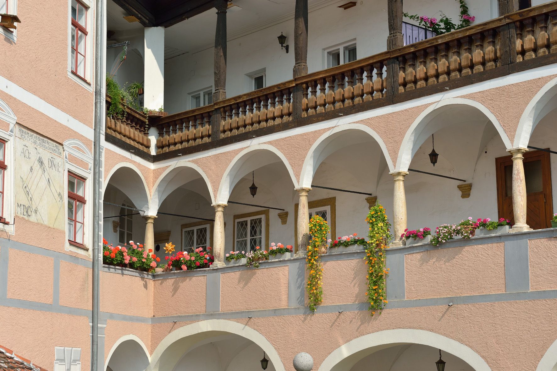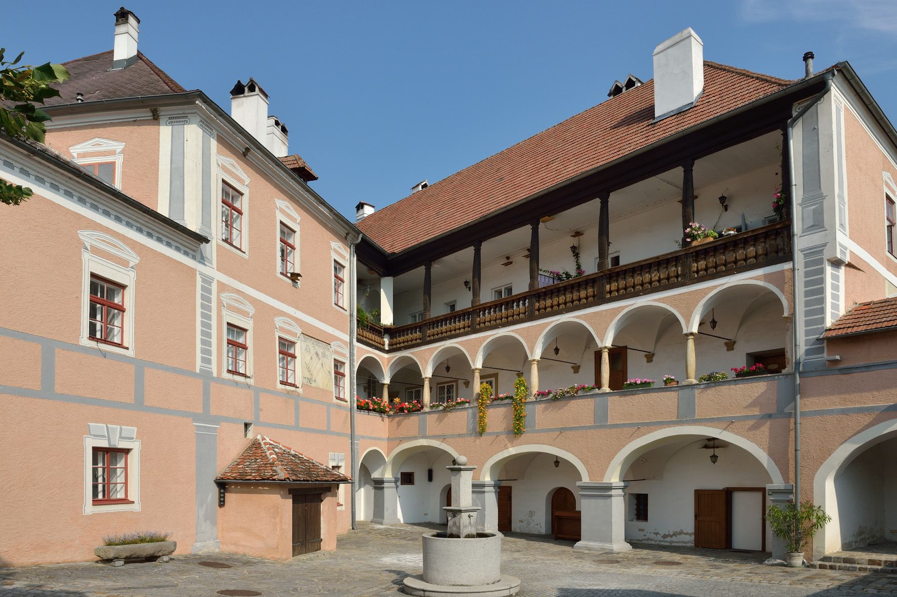 The triangular inner courtyard is bordered by two wings in the shape of a hook. Both wings are the same length. The one on the north side has three-storey, but different arcades, which overlap the main wing with an arch. The main wing has a painted sundial on the courtyard side, which is dated 1600. This castle has been owned by the people of Rossatz in the form of a farming community since 1859.
