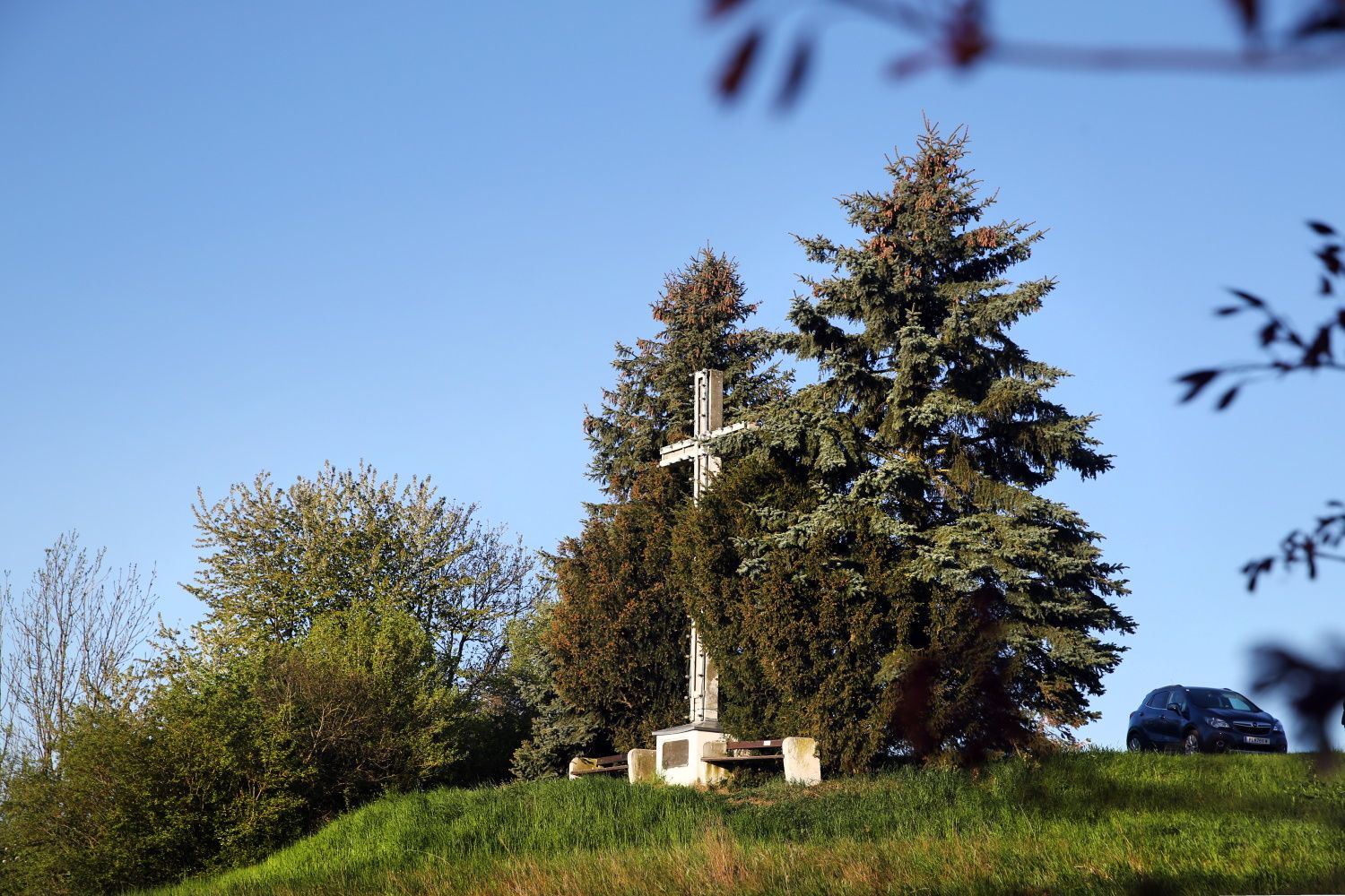 The "Sierninger Cross", which can be seen from afar, stands on a concrete pedestal and was cast from the same material with reinforcing bars in a single element. It is located at an altitude of 301m above sea level. This attractive hiking destination is also part of the "Dunkelsteinerwaldrunde". The footpath from the district of Groß-Sierning - Hauptstraße via Berggasse is one of several routes that can be chosen. The cross is flanked by two benches where you can linger. It is also shaded by trees.