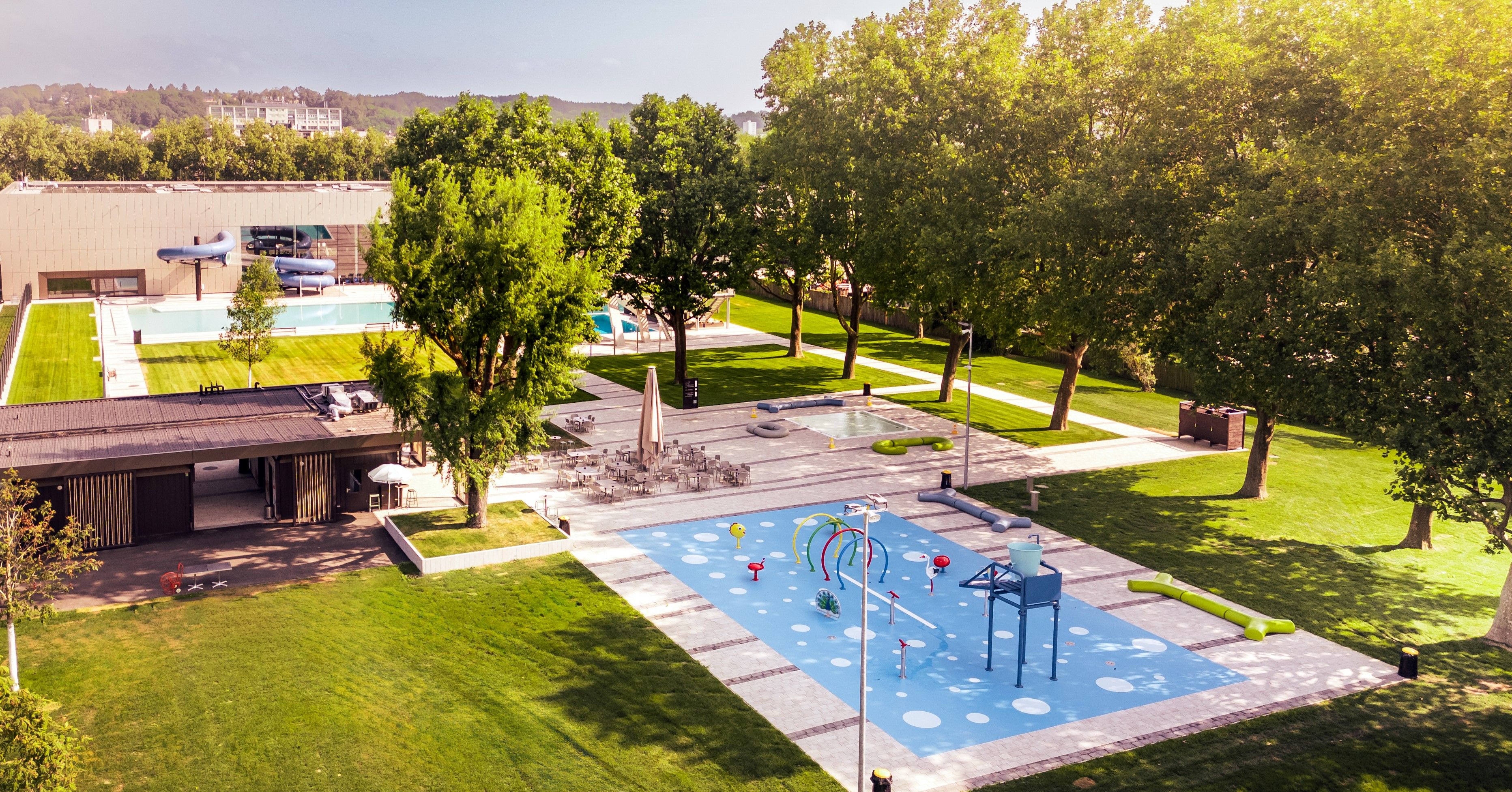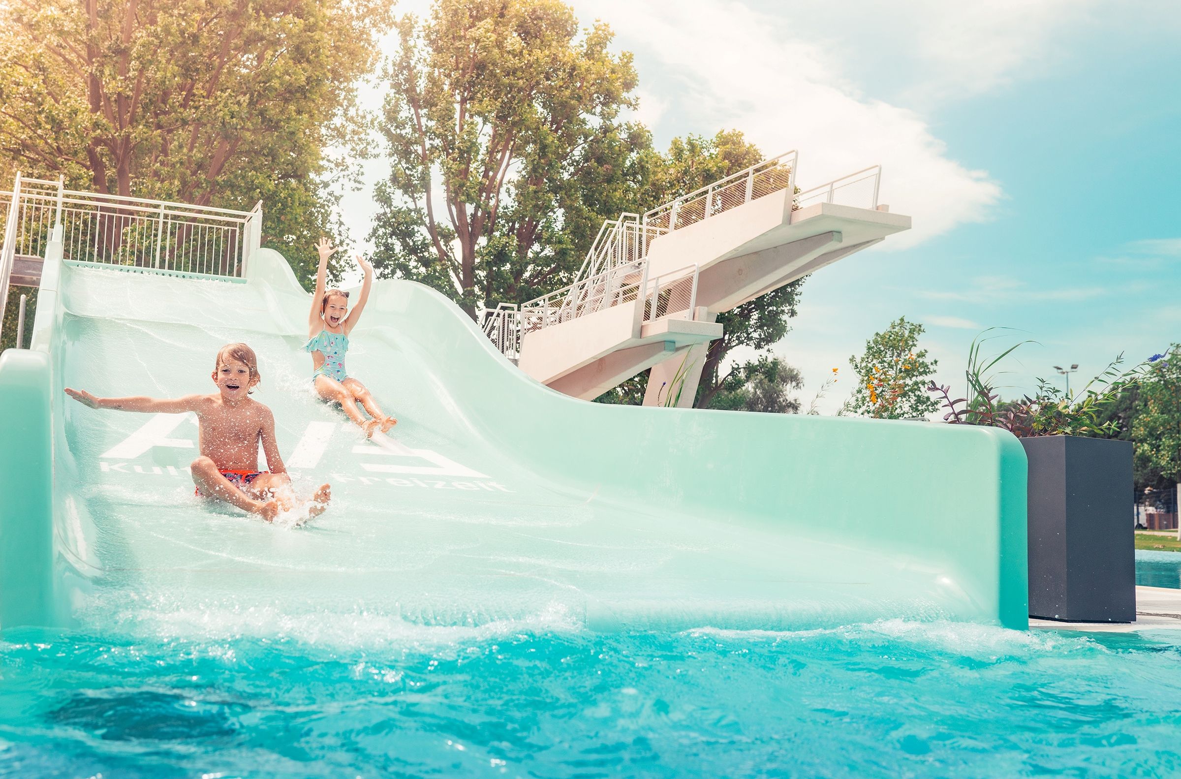The new children's and family area offers a baby pool with a sun sail, a 285 m² water play park, a new wave slide and three diving platforms (1m, 3m, 5m). There is also a beach volleyball court.
